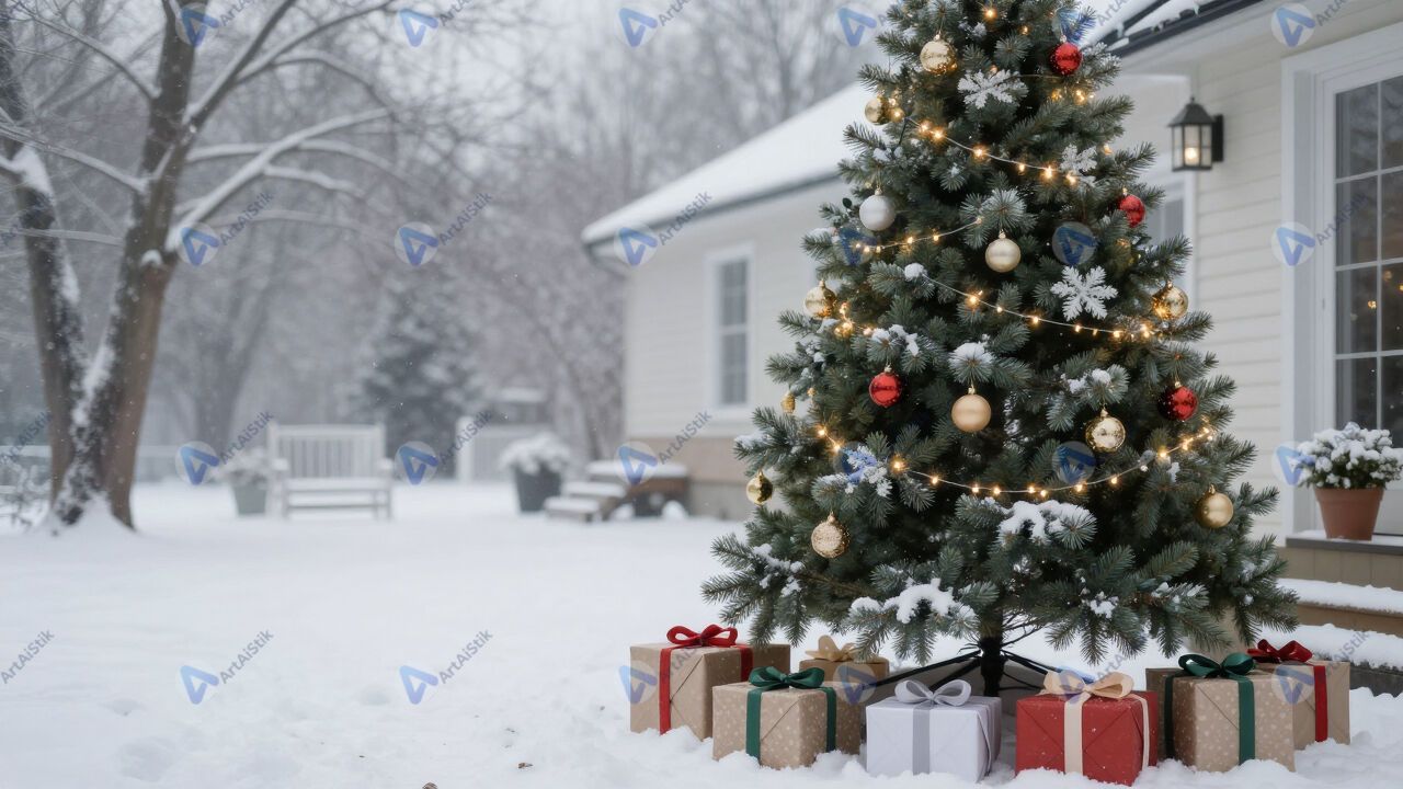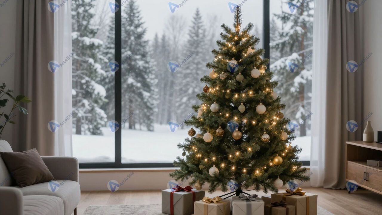 Новогодняя ёлка зимой, огни, подарки, уют.