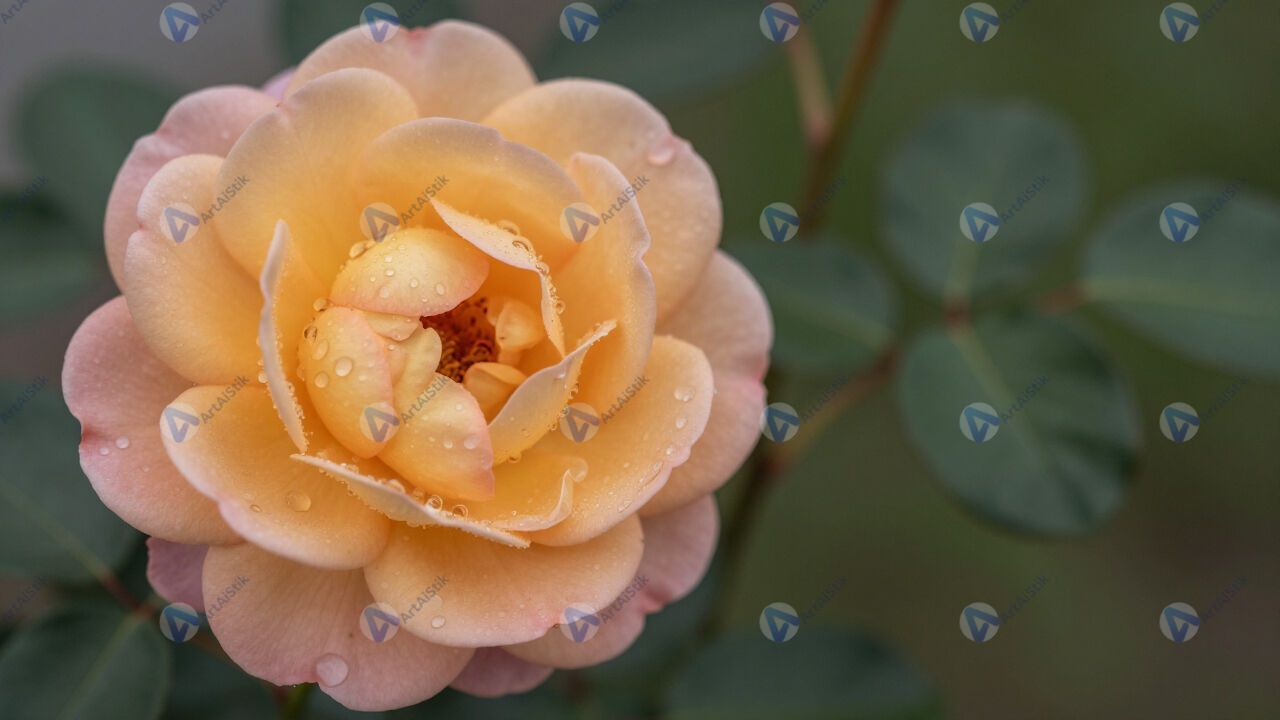 Крупный план розы с каплями росы, размытый зелёный фон.