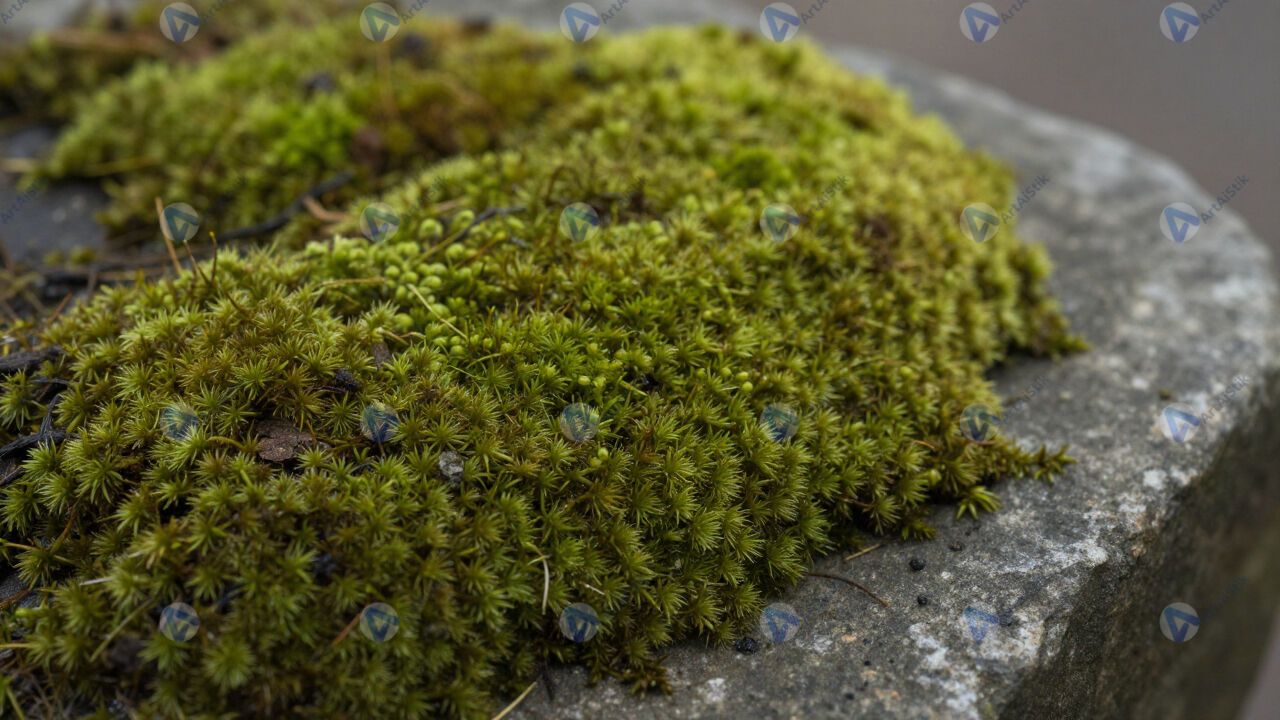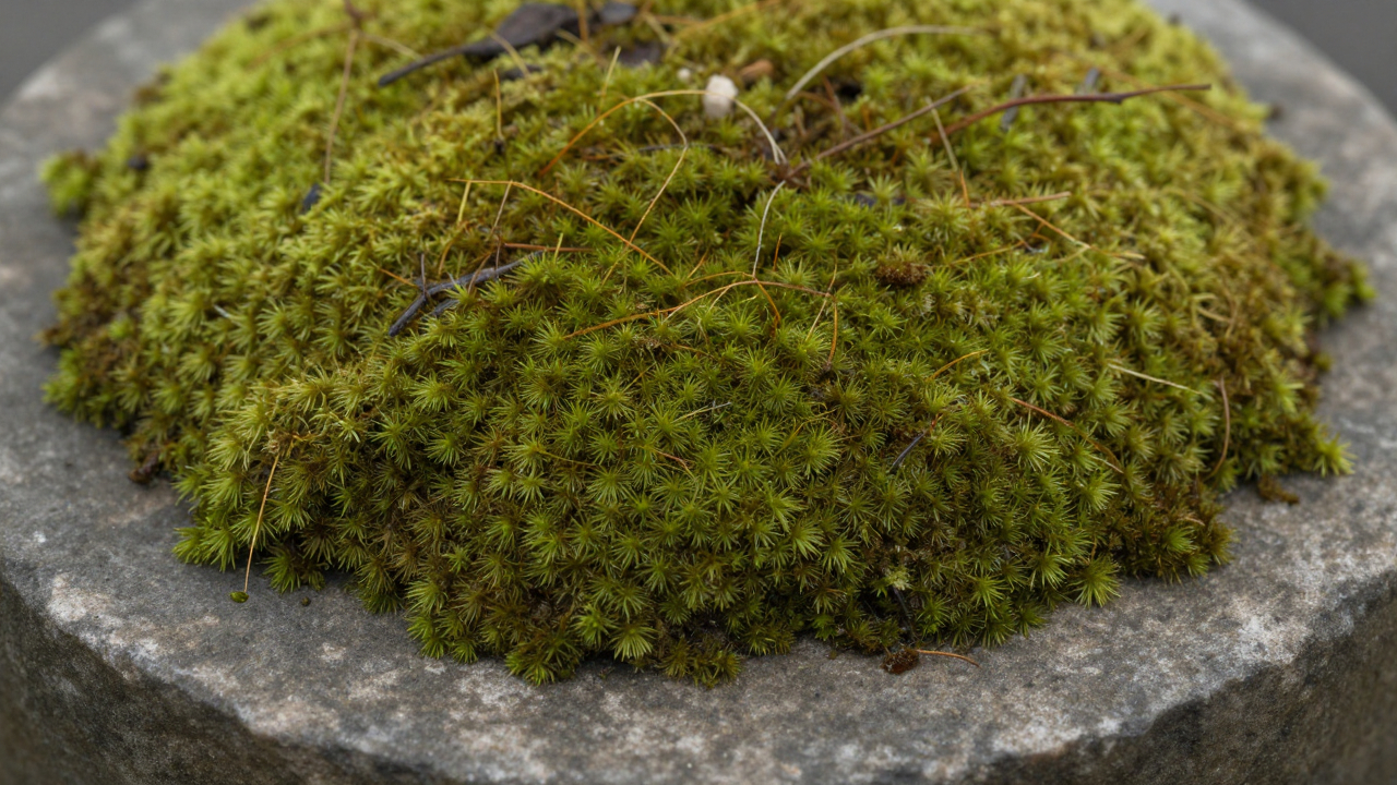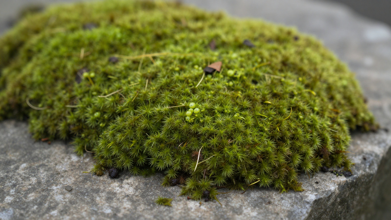 Крупный план мха на камне, ярко‑зелёная текстура.