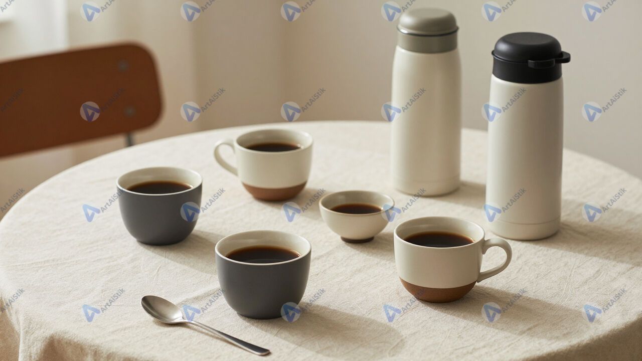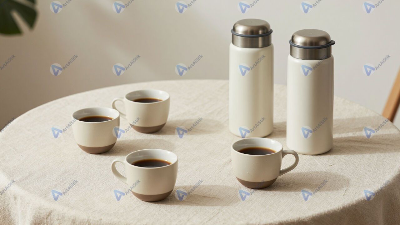 Стол кофебрейка с стаканчиками и термосами на скатерти.