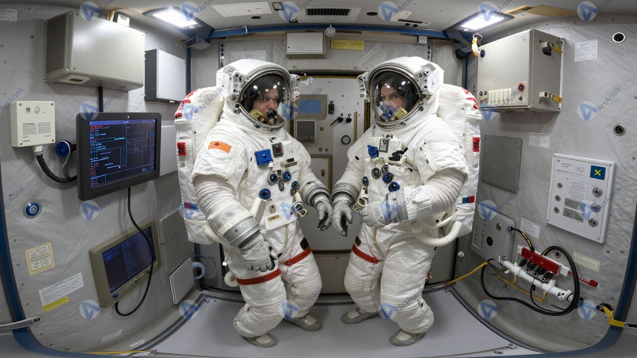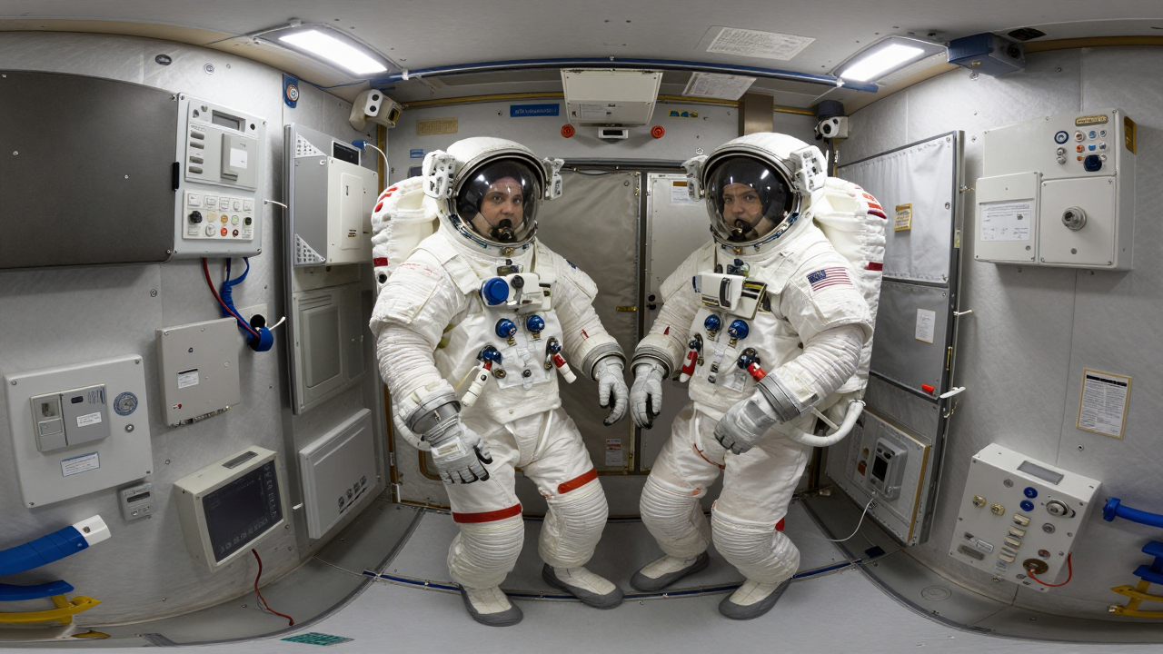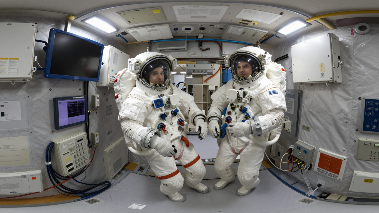 Космонавты внутри модуля станции, вокруг оборудование и провода.