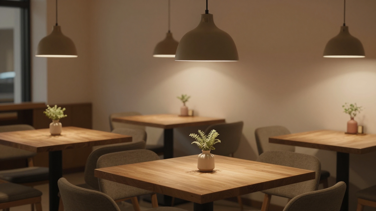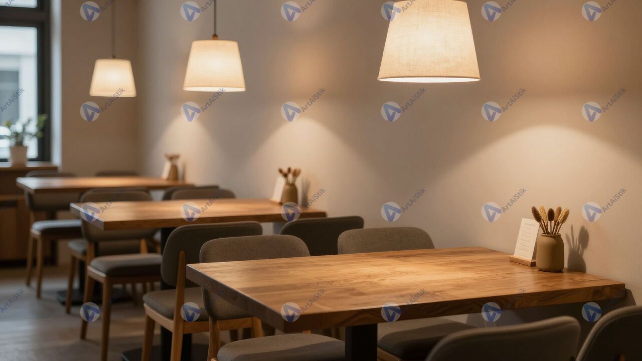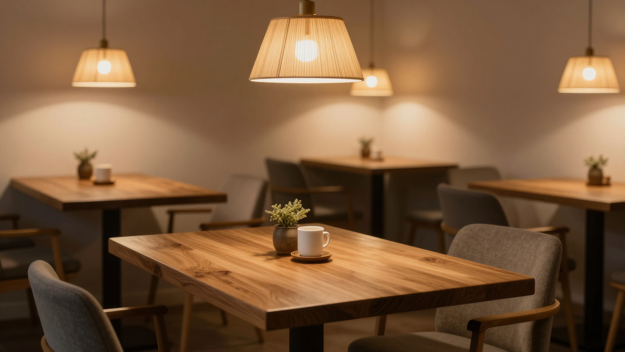 Уютное кафе с деревянными столами, лампы.