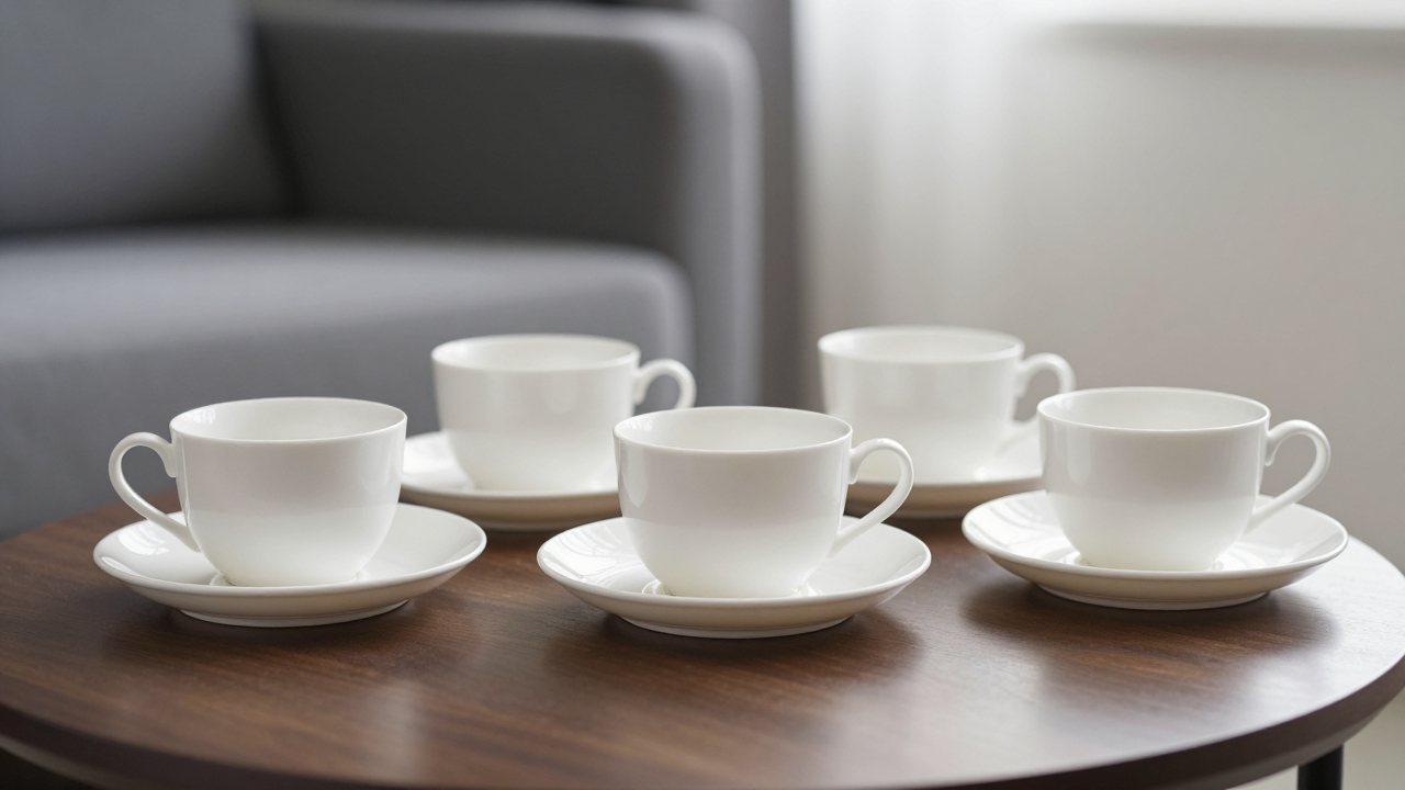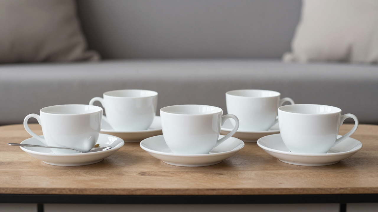 Чашки и блюдца, стоящие в ряд на кофейном столике.