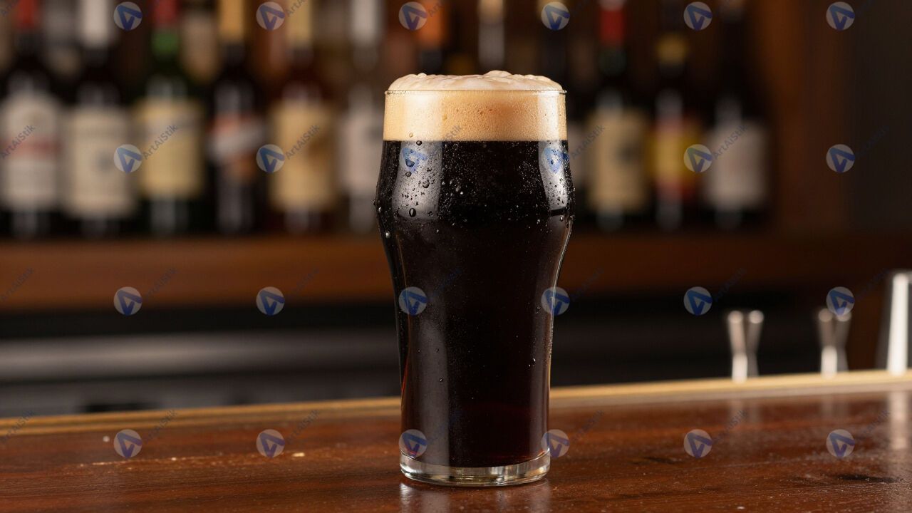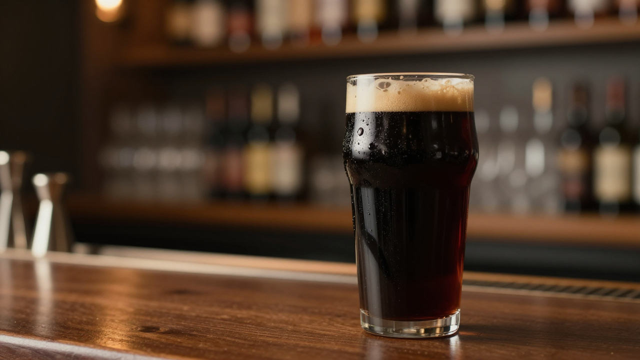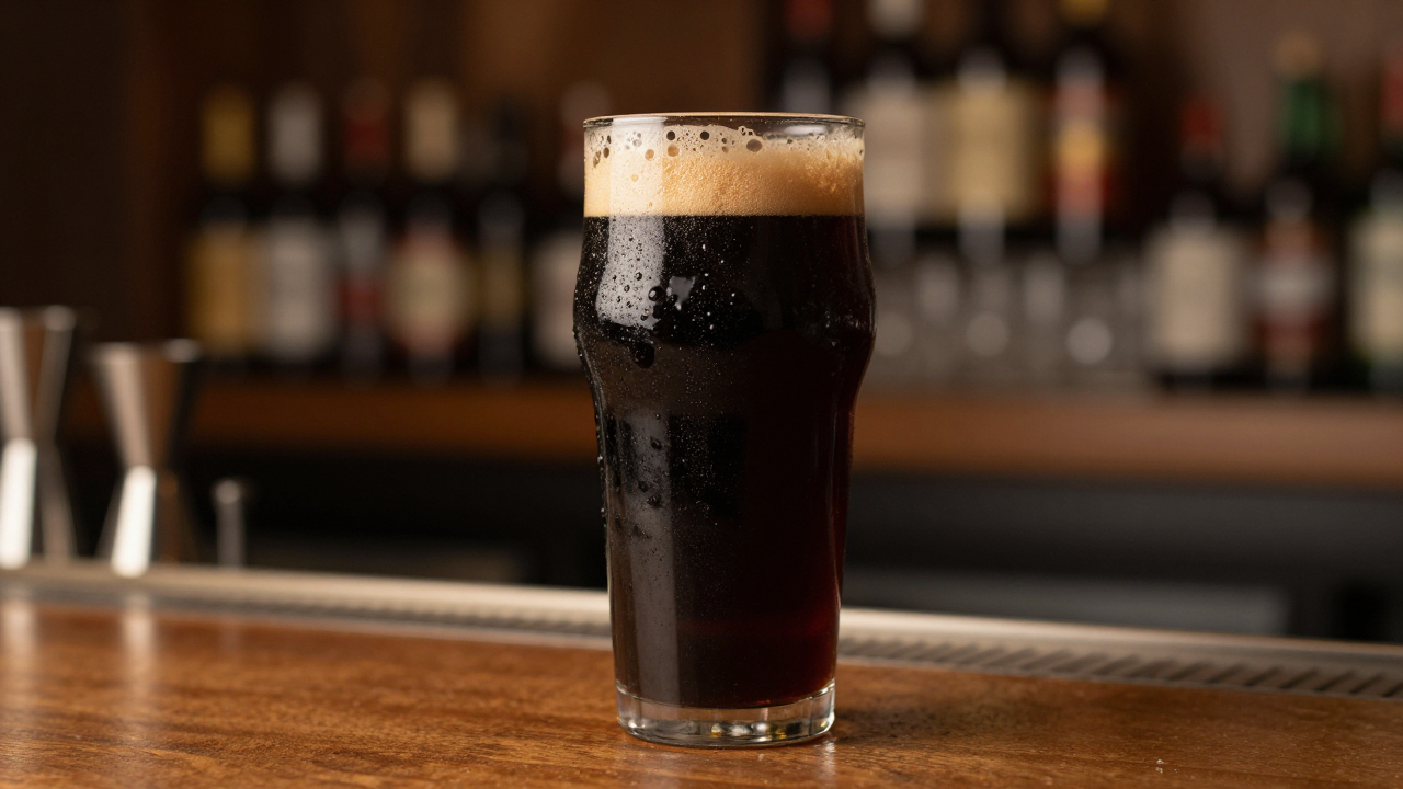 Тёмное пиво в бокале, барная стойка на заднем плане.
