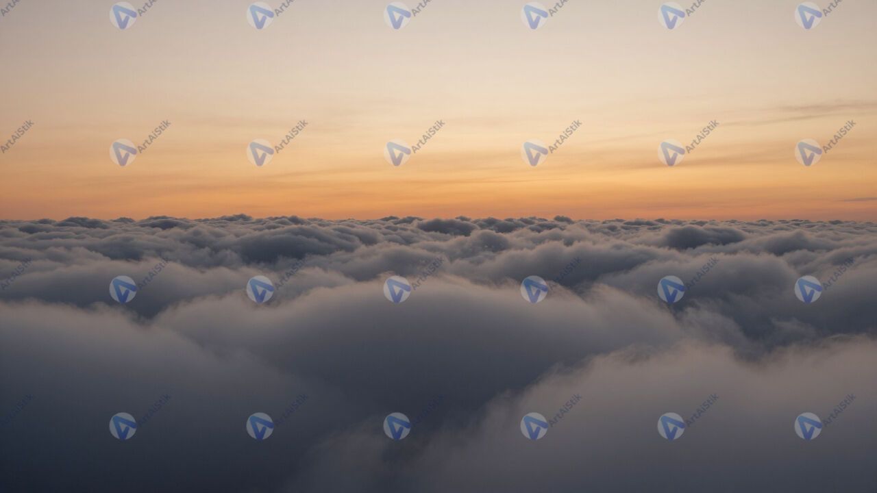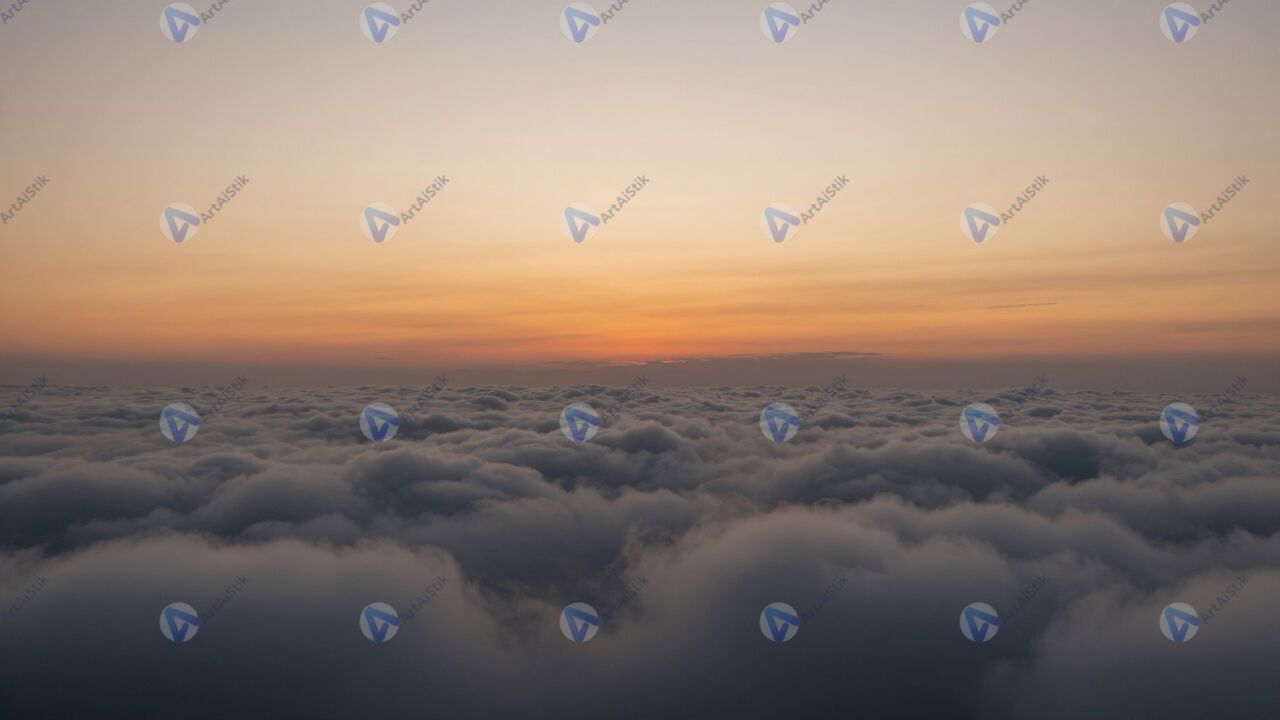 Рассвет над облаками, вид с самолёта, оранжевая линия горизонта.