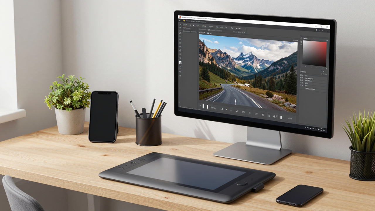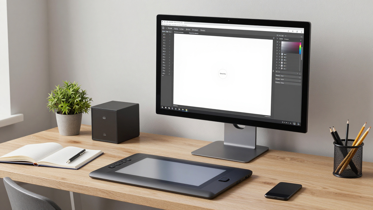 Рабочее место дизайнера: большой монитор, графический планшет.