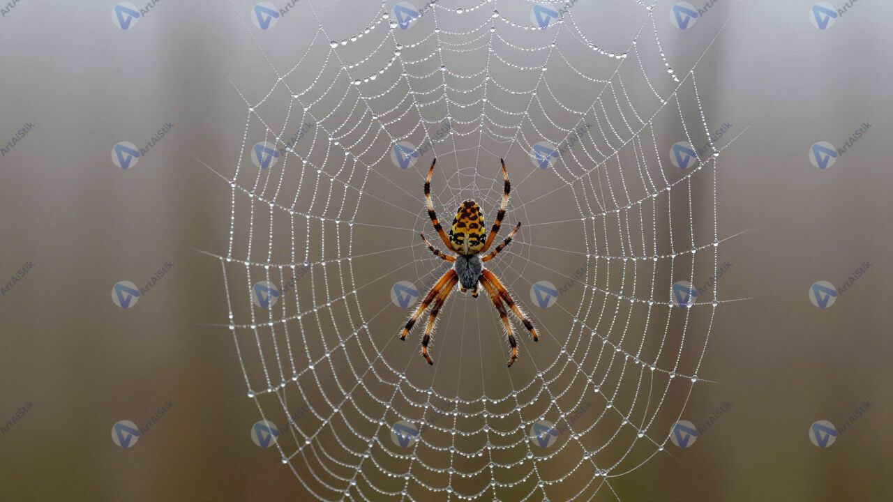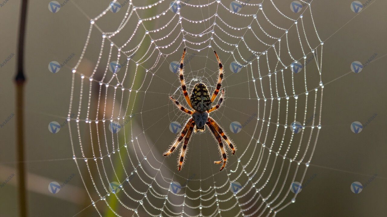 Роса на паутине, утренний свет, размытый фон.