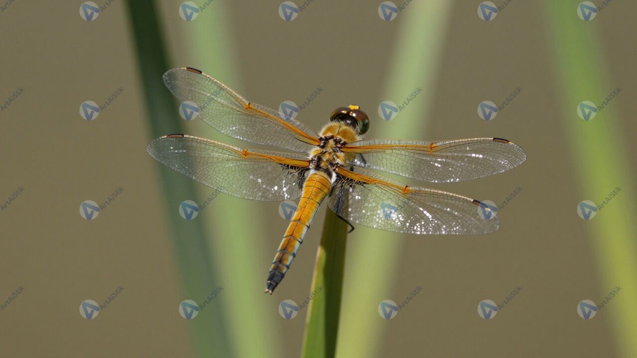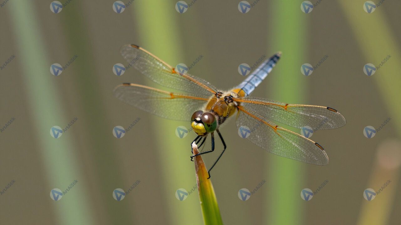 Стрекоза на тростнике, крылья с прожилками, макро.