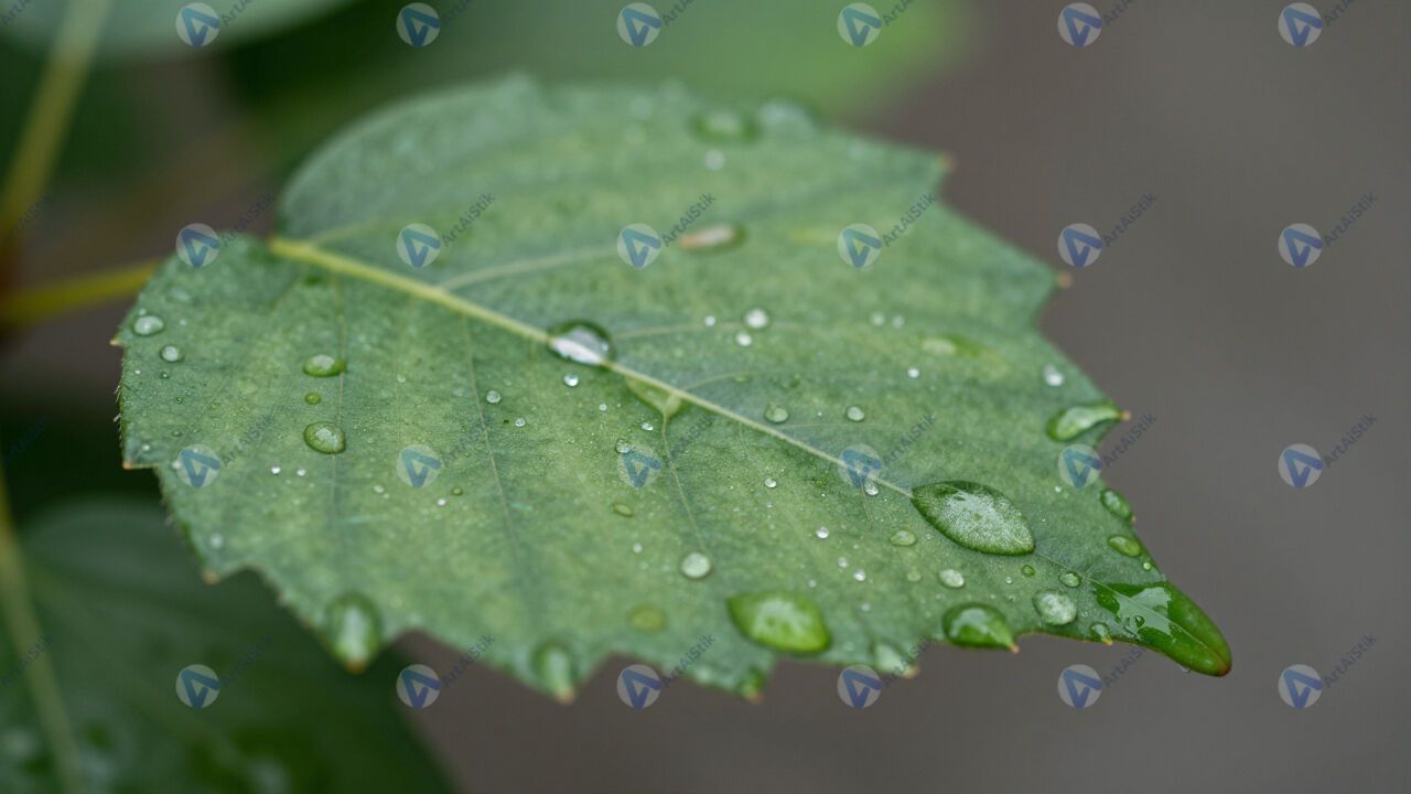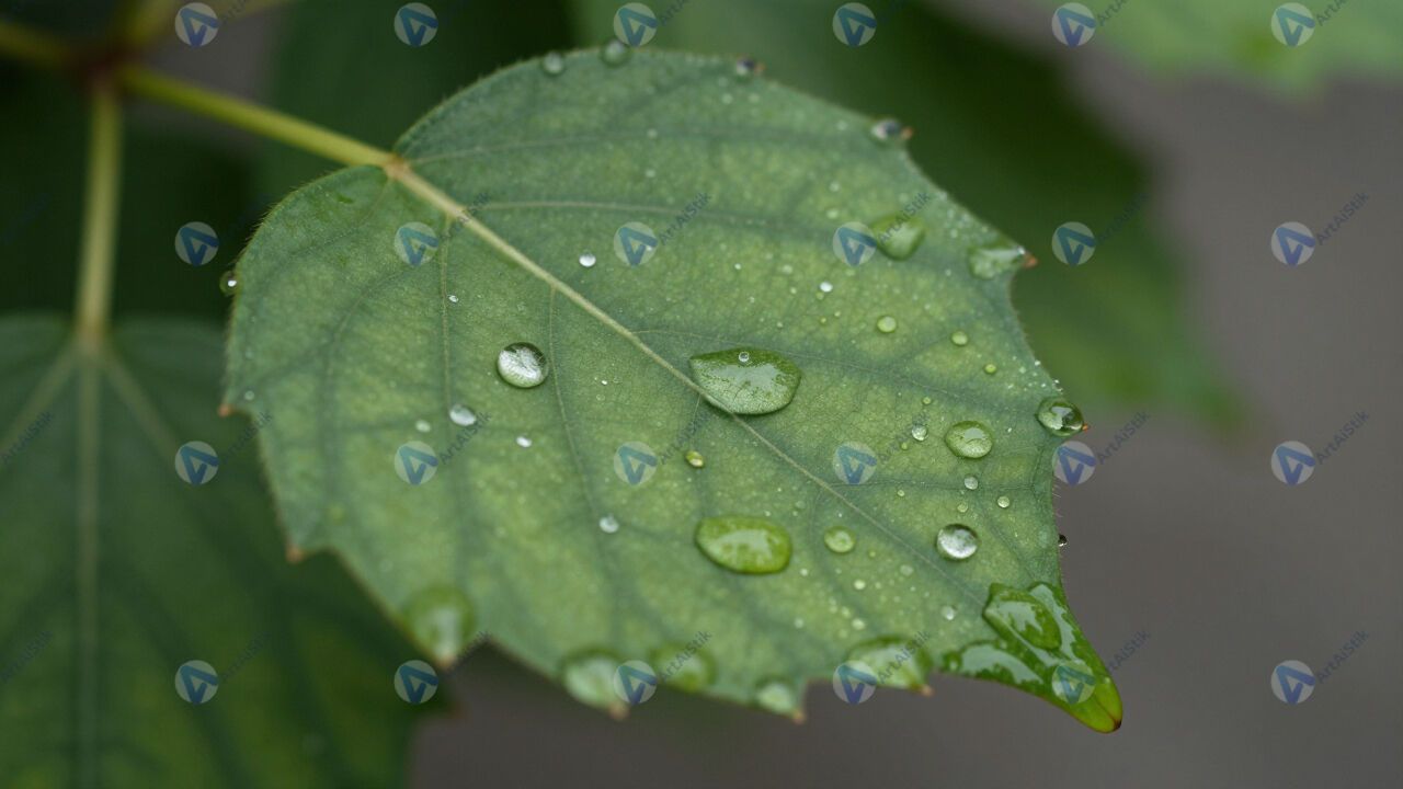 Капли воды на листе после дождя, макро, размытый фон.
