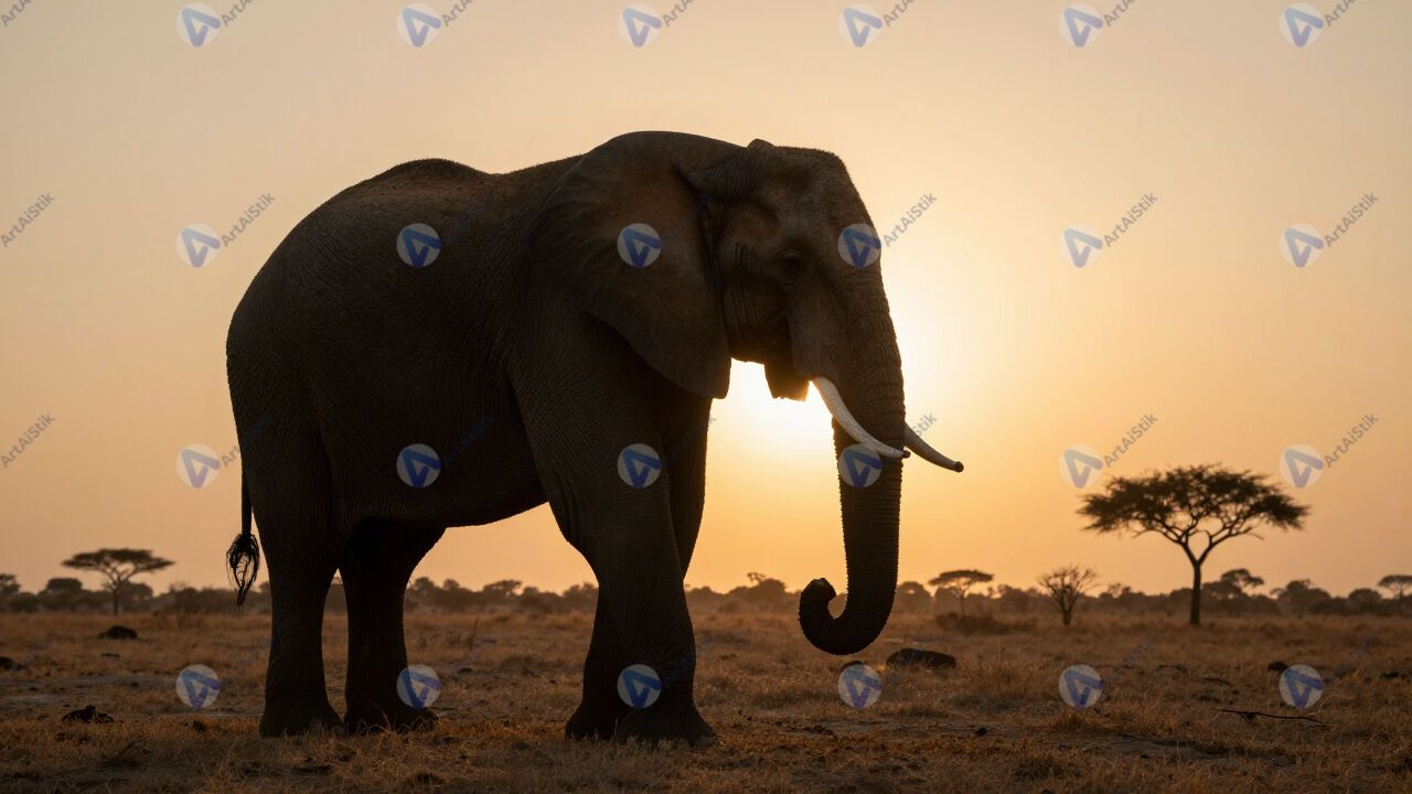 Слон в саванне на закате, силуэт, пыльное небо.