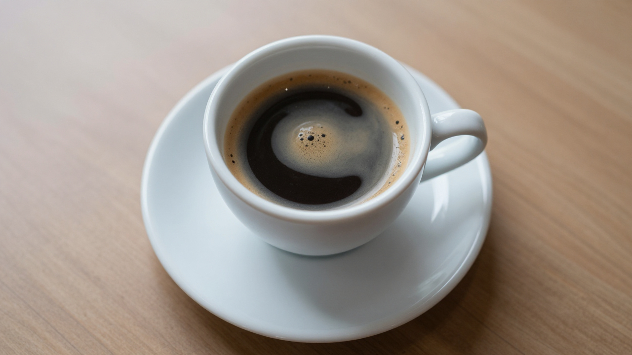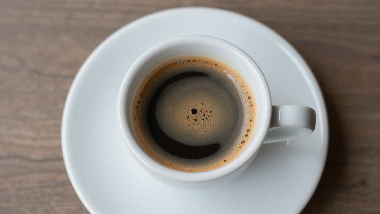 Эспрессо в маленькой белой чашке на блюдце, вид сверху.