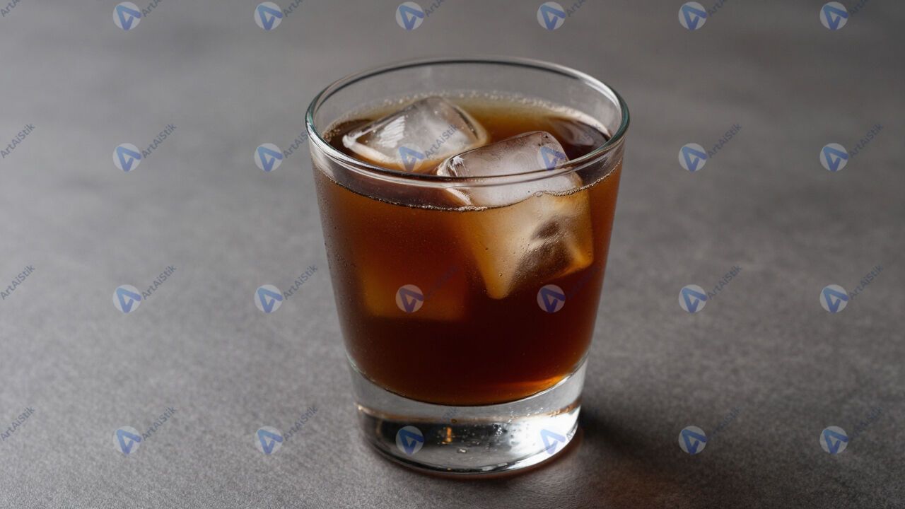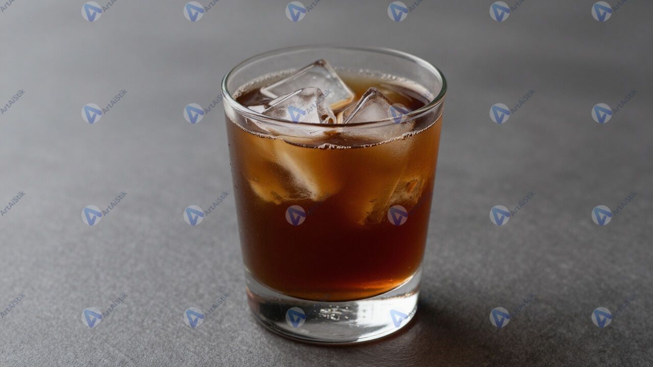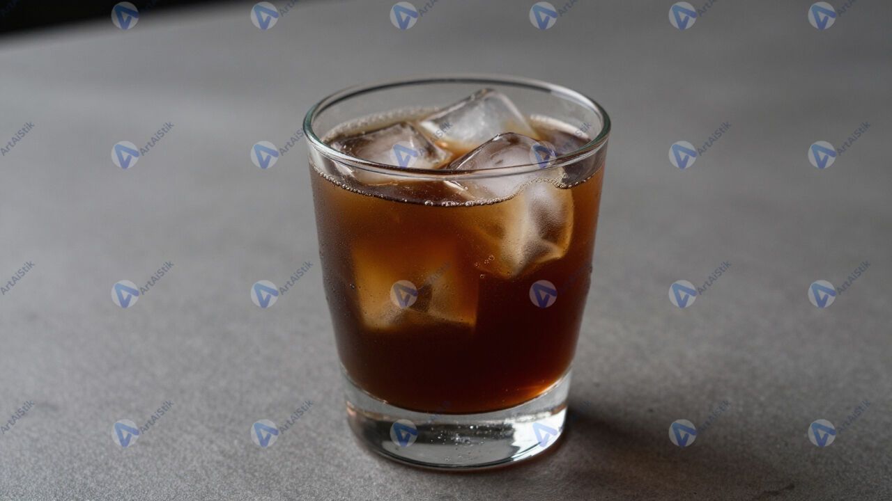 Эспрессо‑тоник с льдом в прозрачном стакане.