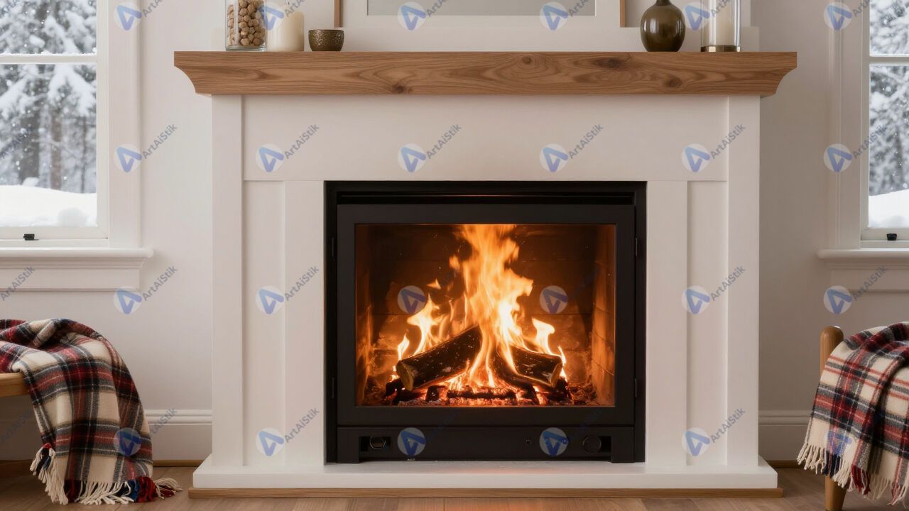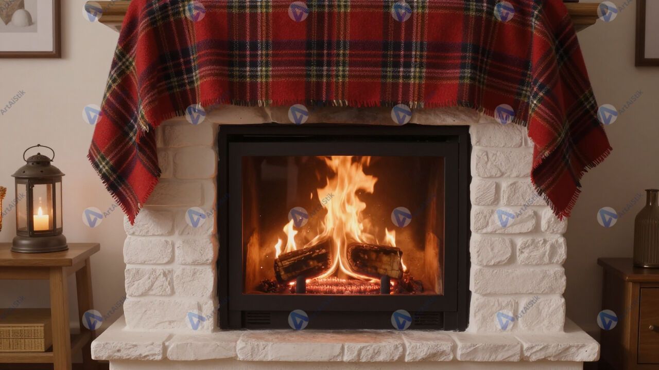 Камин зимой, огонь, плед, уютный интерьер.