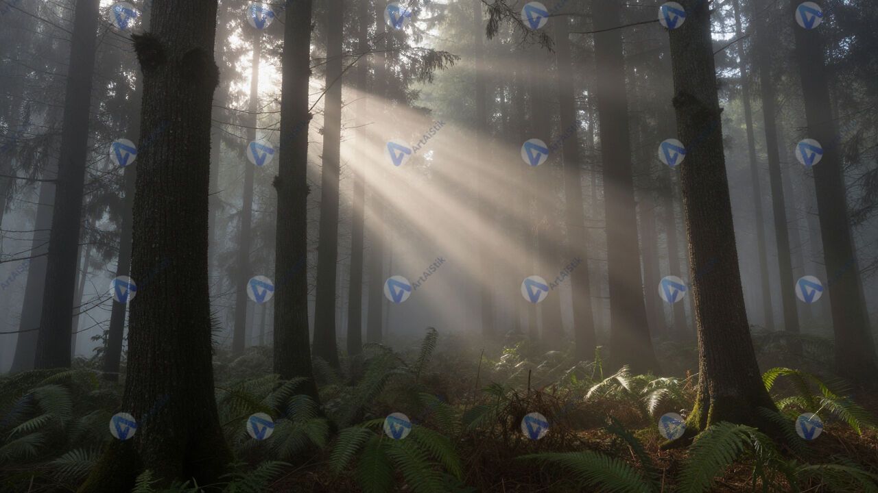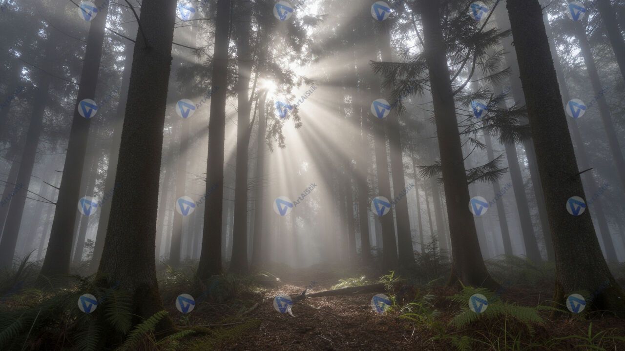Туман в лесу, лучи света сквозь деревья.