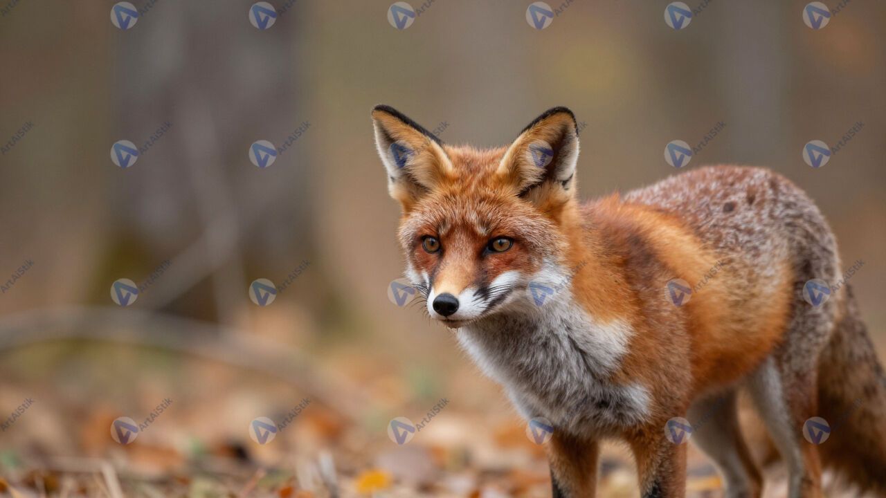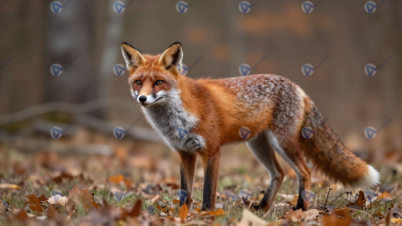 Лиса осенью в лесу, рыжая шерсть, листья.