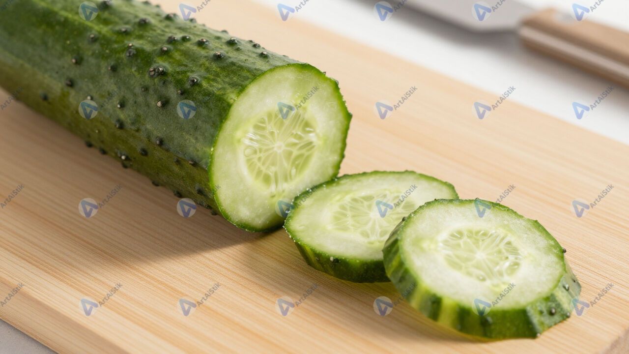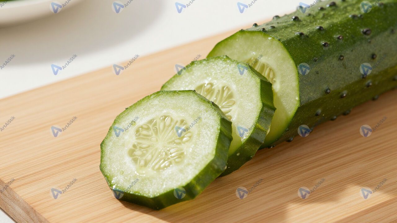 Свежий огурец нарезан кружочками на разделочной доске.