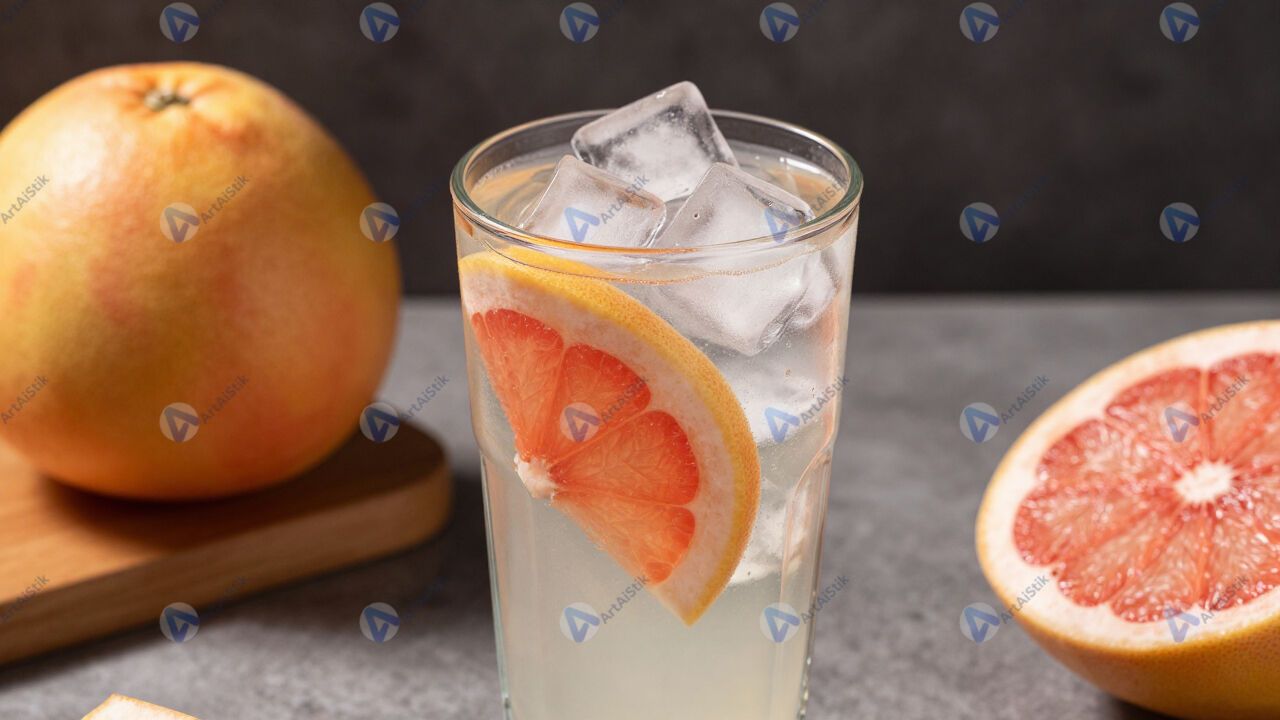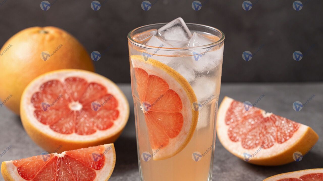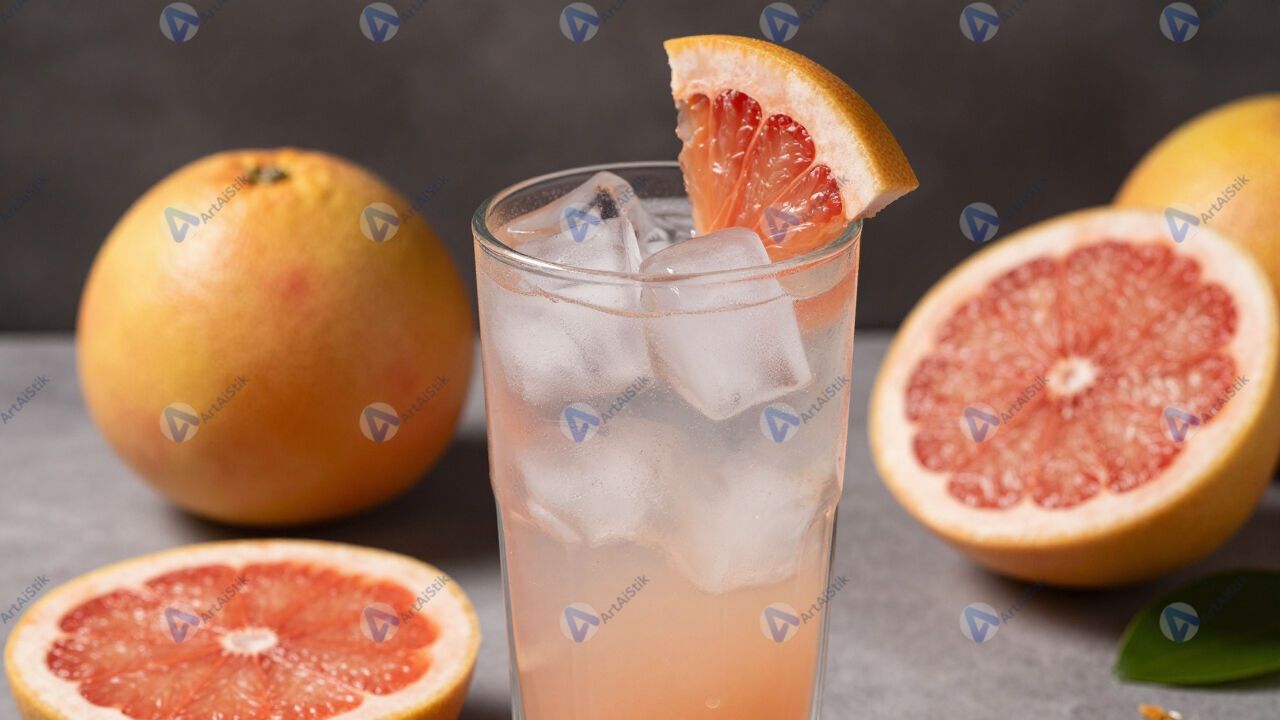 Грейпфрутовый фреш в высоком стакане с кубиками льда.