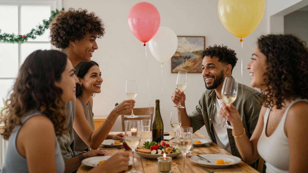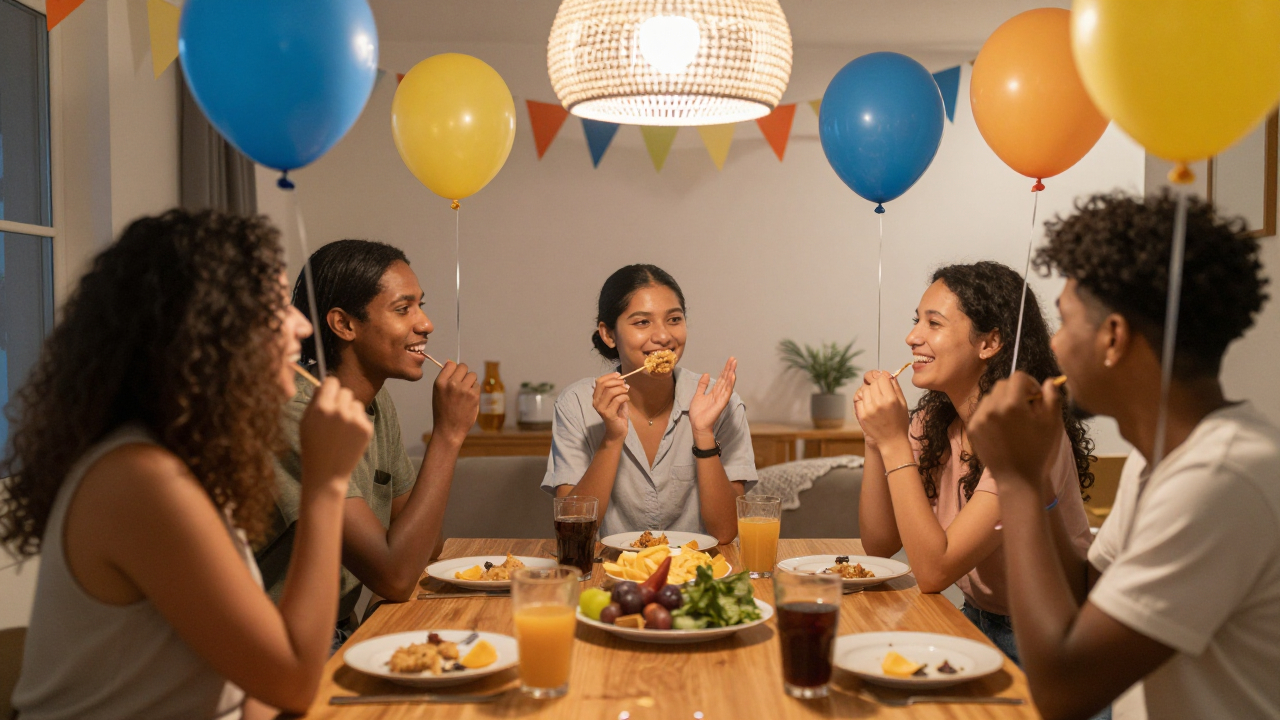 Друзья на домашней вечеринке, шарики и гирлянды.
