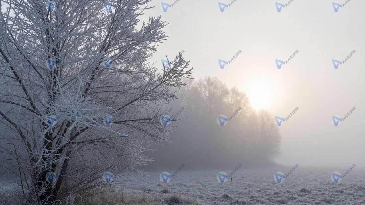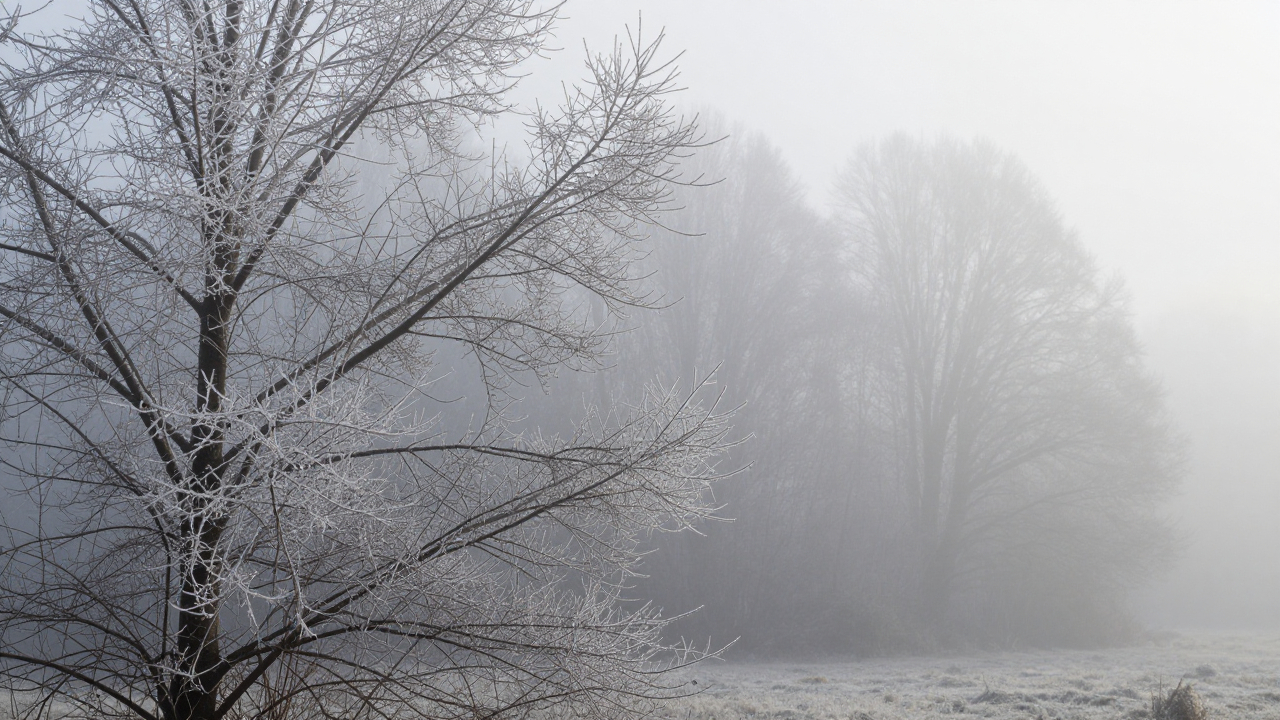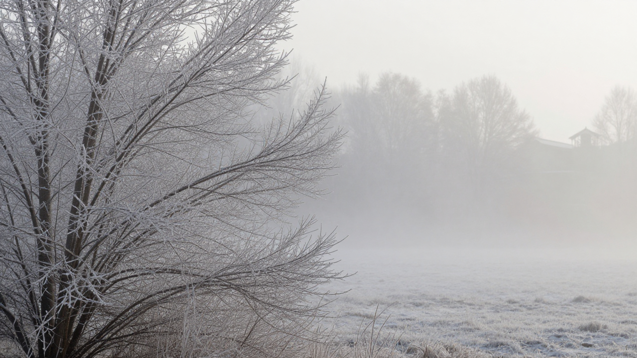 Иней на ветках, утренний туман, холодное освещение.
