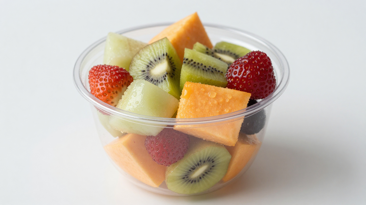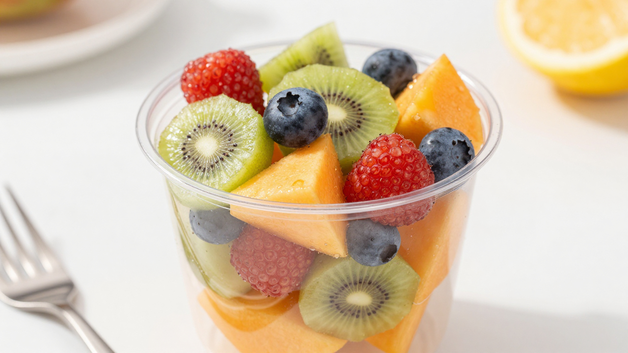 Фруктовый салат в прозрачной чашке, яркие кусочки.