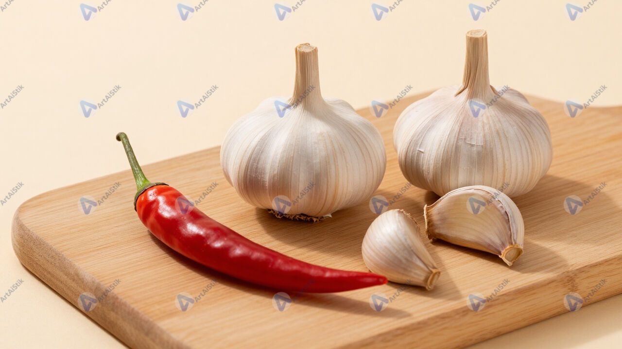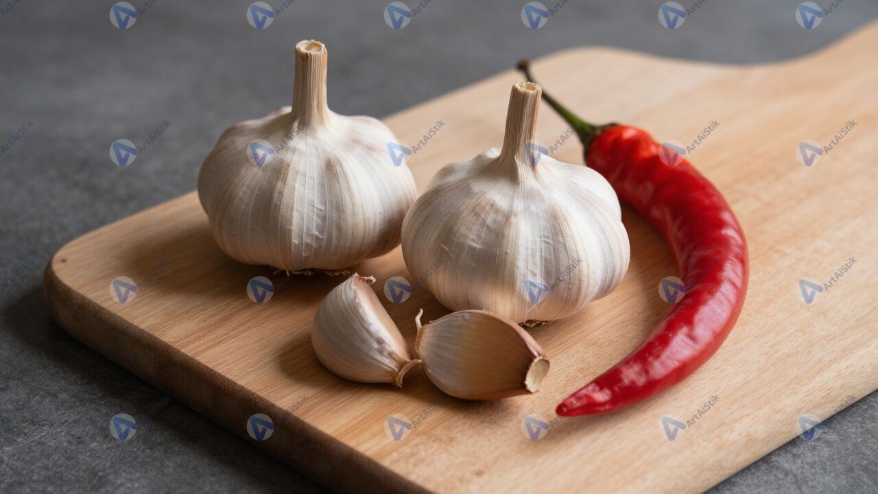 Чеснок и перец чили на деревянной доске.
