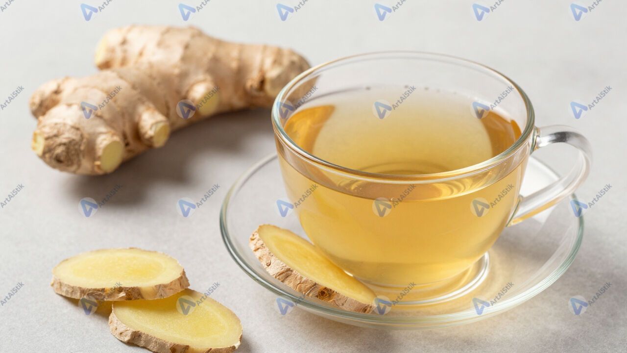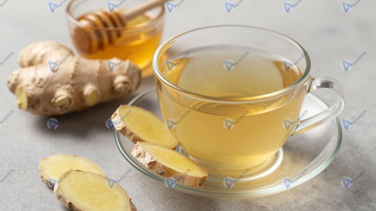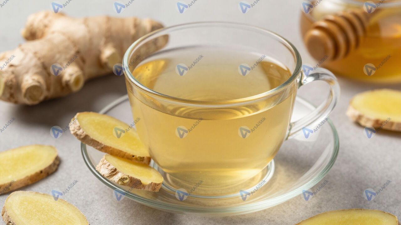 Имбирный чай с ломтиками имбиря и мёдом на блюдце.