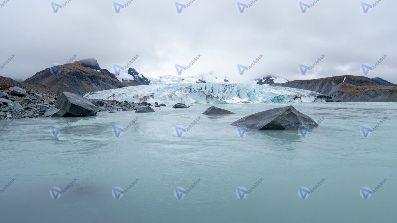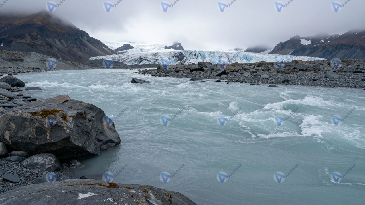 Ледниковая река с молочно-бирюзовой водой, камни.