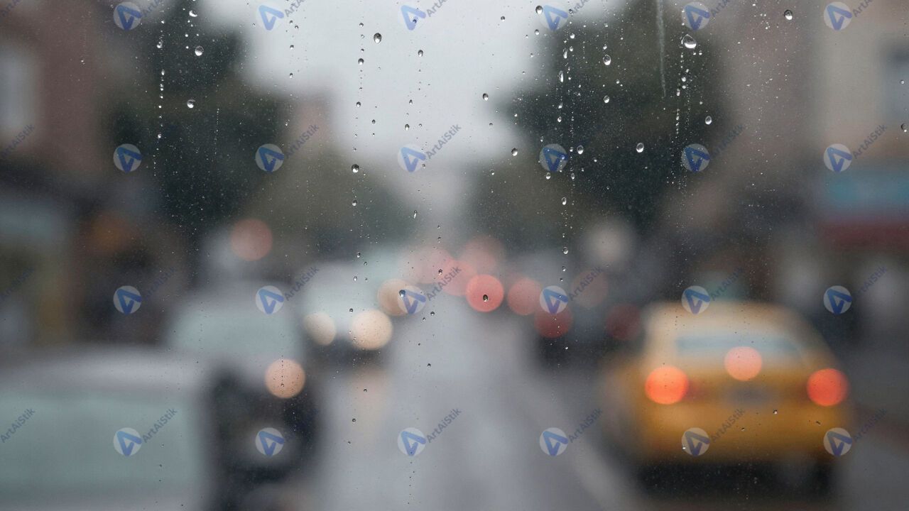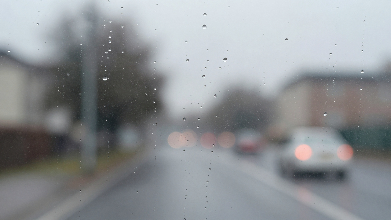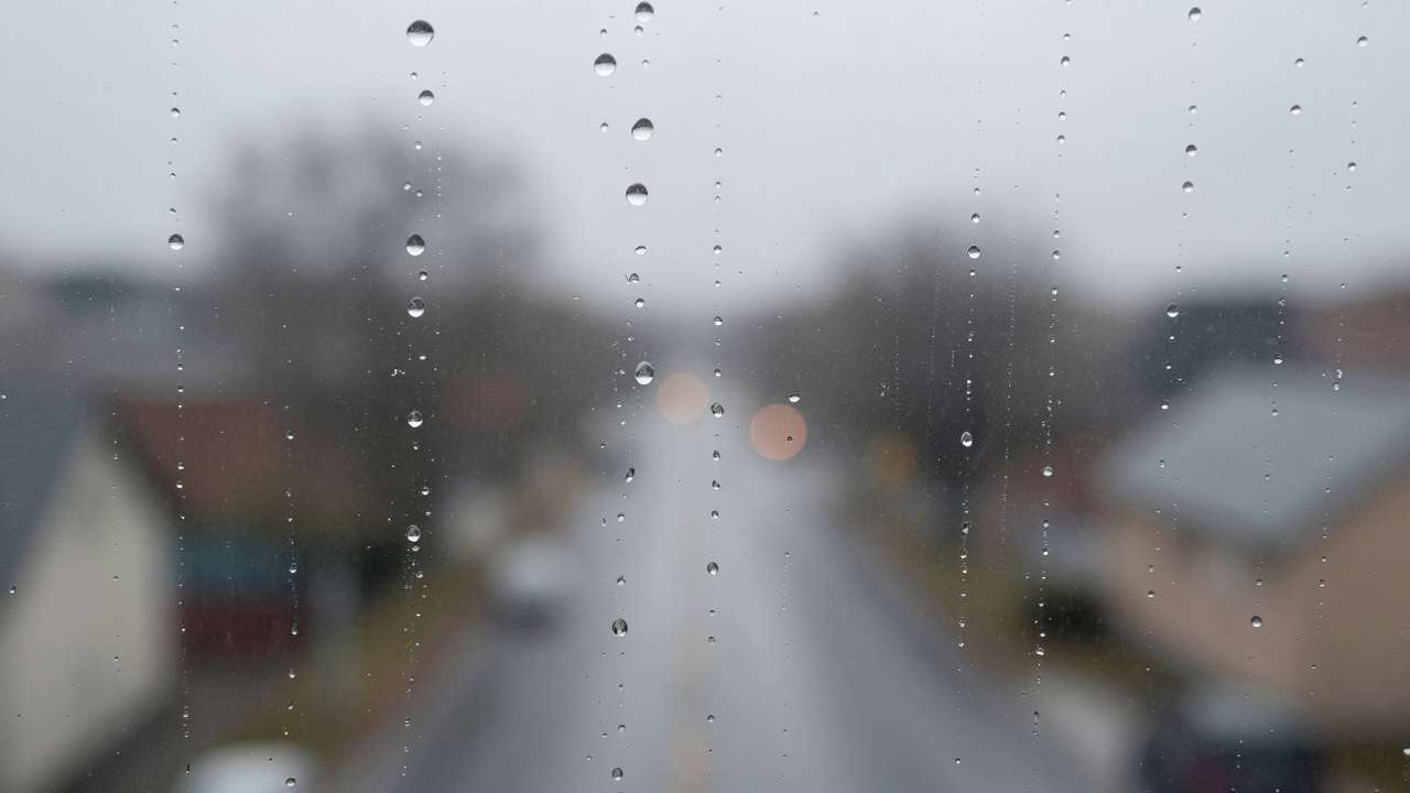 Стекло с каплями дождя, размытый фон за ним.