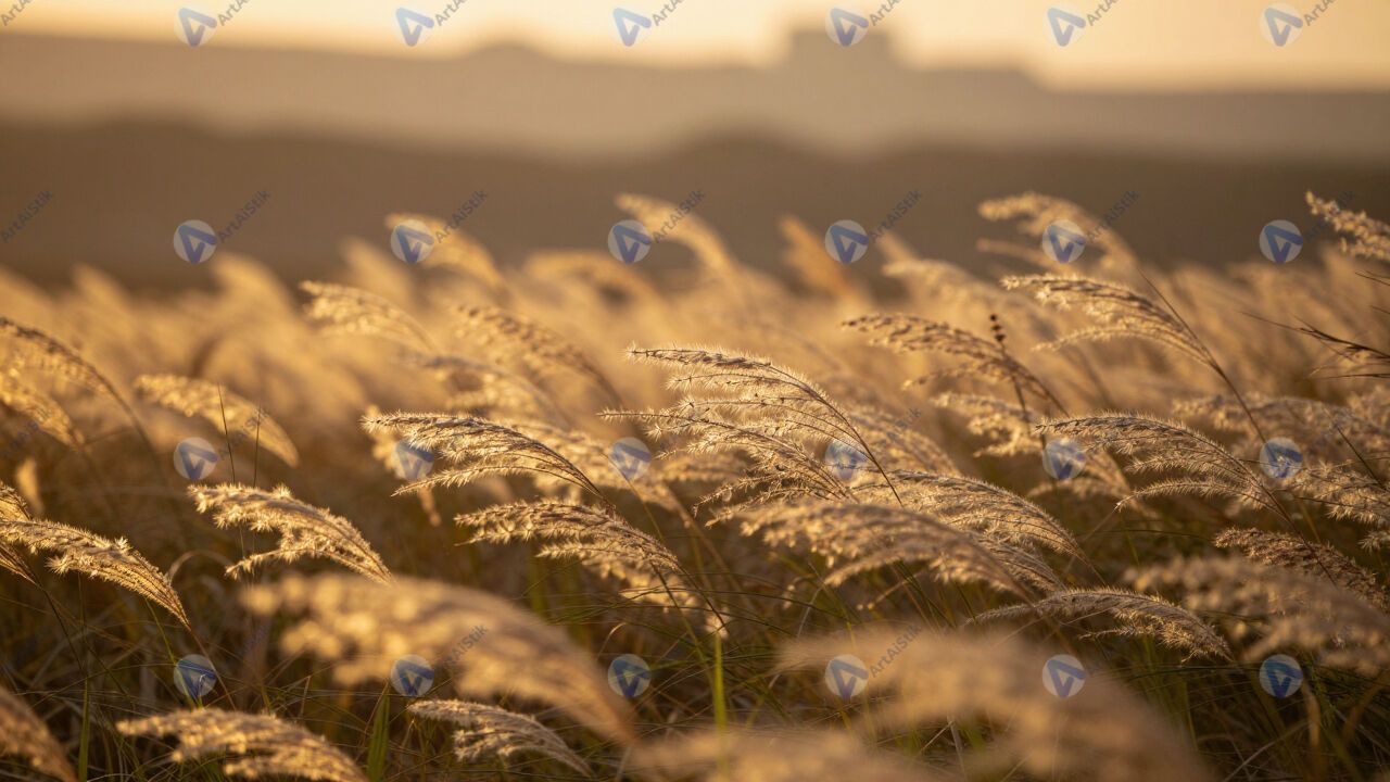Трава на ветру, колышется, золотой час, размытый фон.
