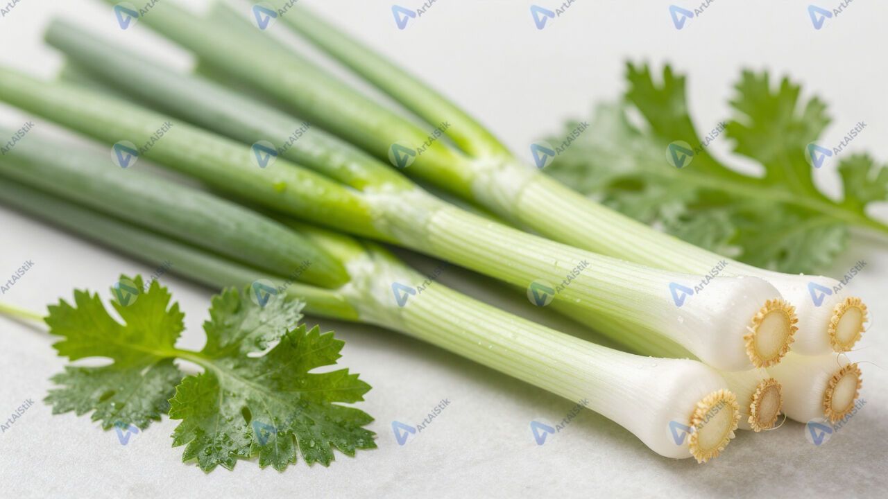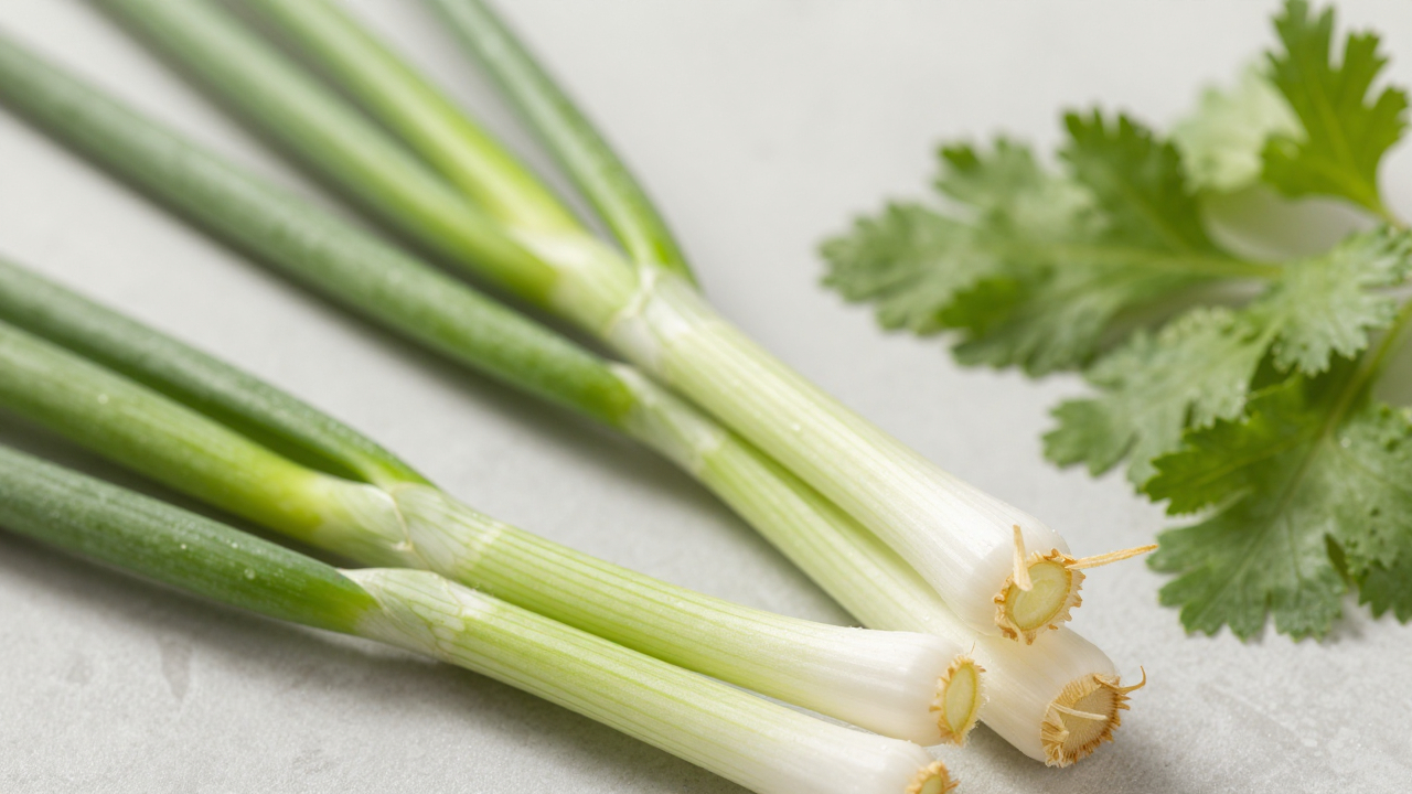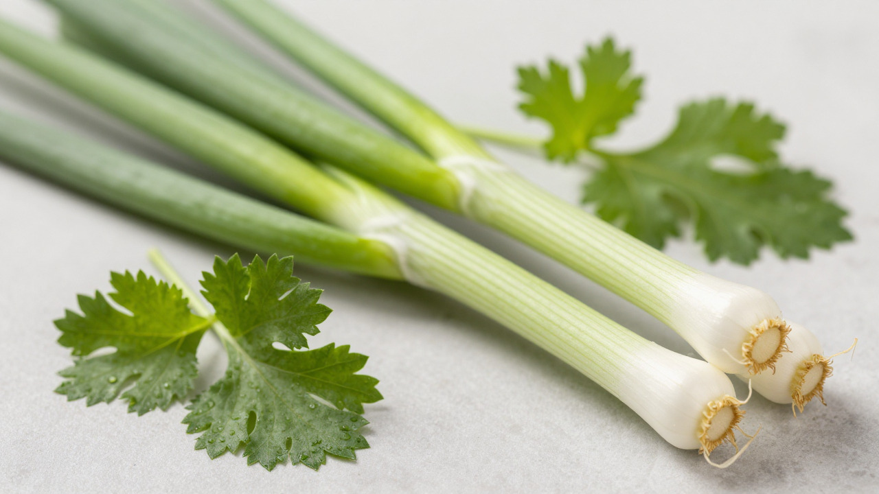 Зеленый лук и кинза на светлом фоне, крупный план.