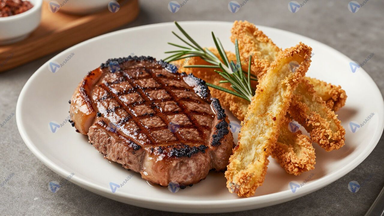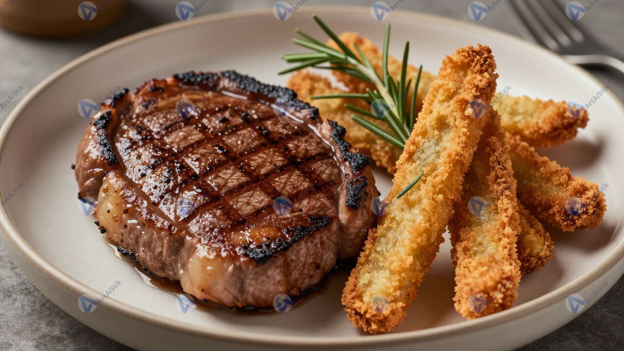 Стейк на гриле с полосками прожарки и веточкой розмарина.