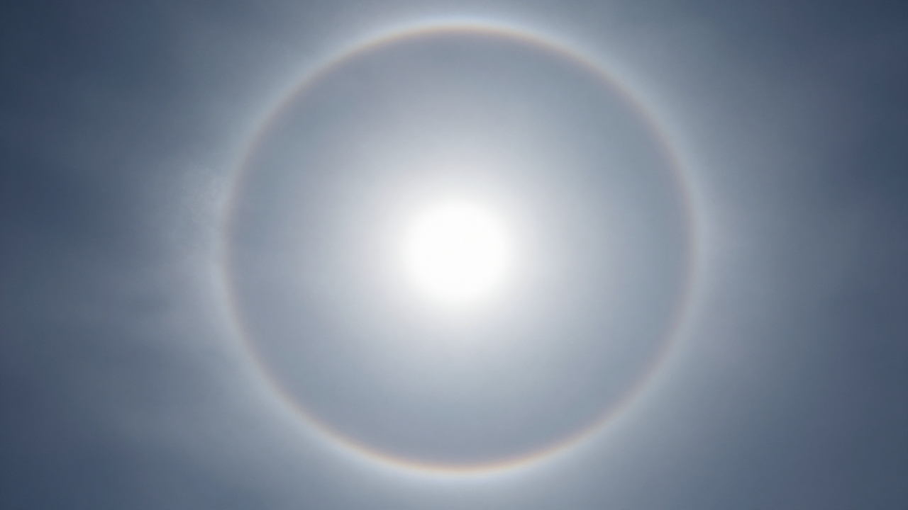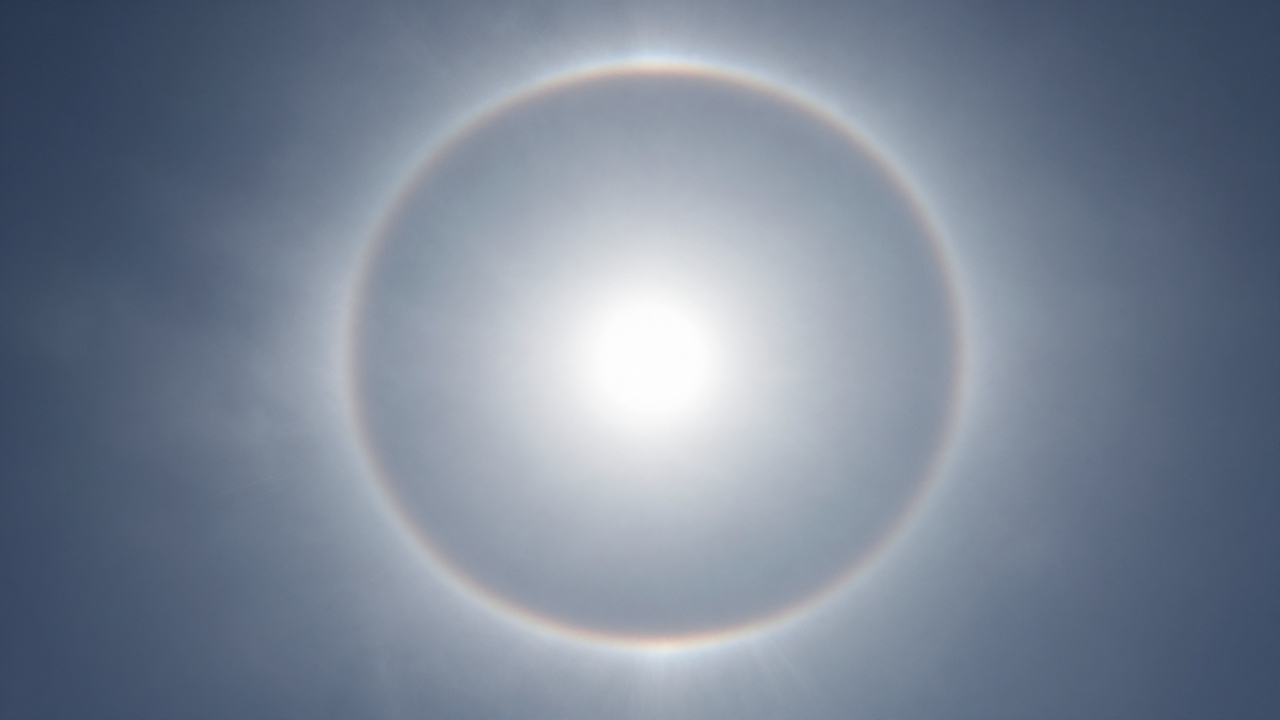 Гало вокруг солнца, ледяные кристаллы в облаках.