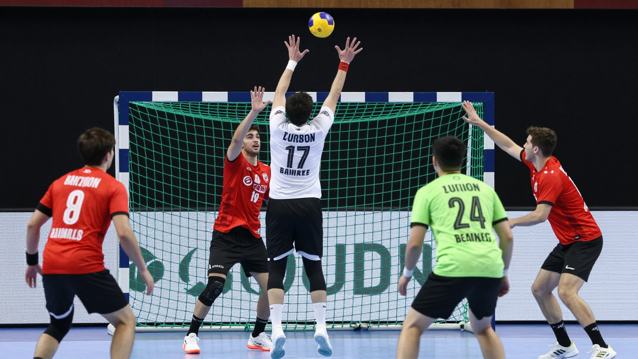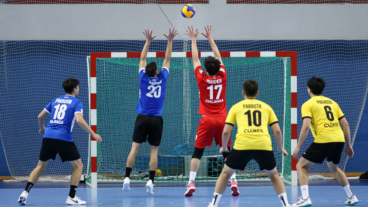 Игроки в гандболе атакуют ворота, мяч в воздухе.