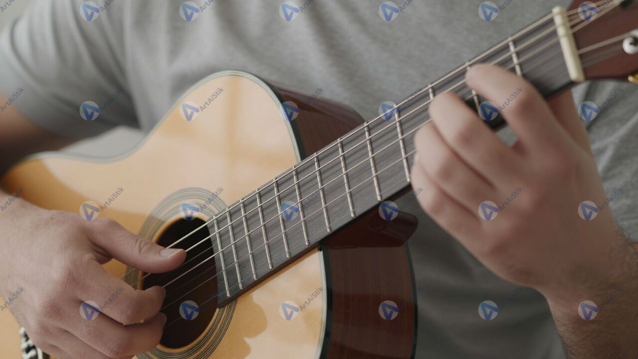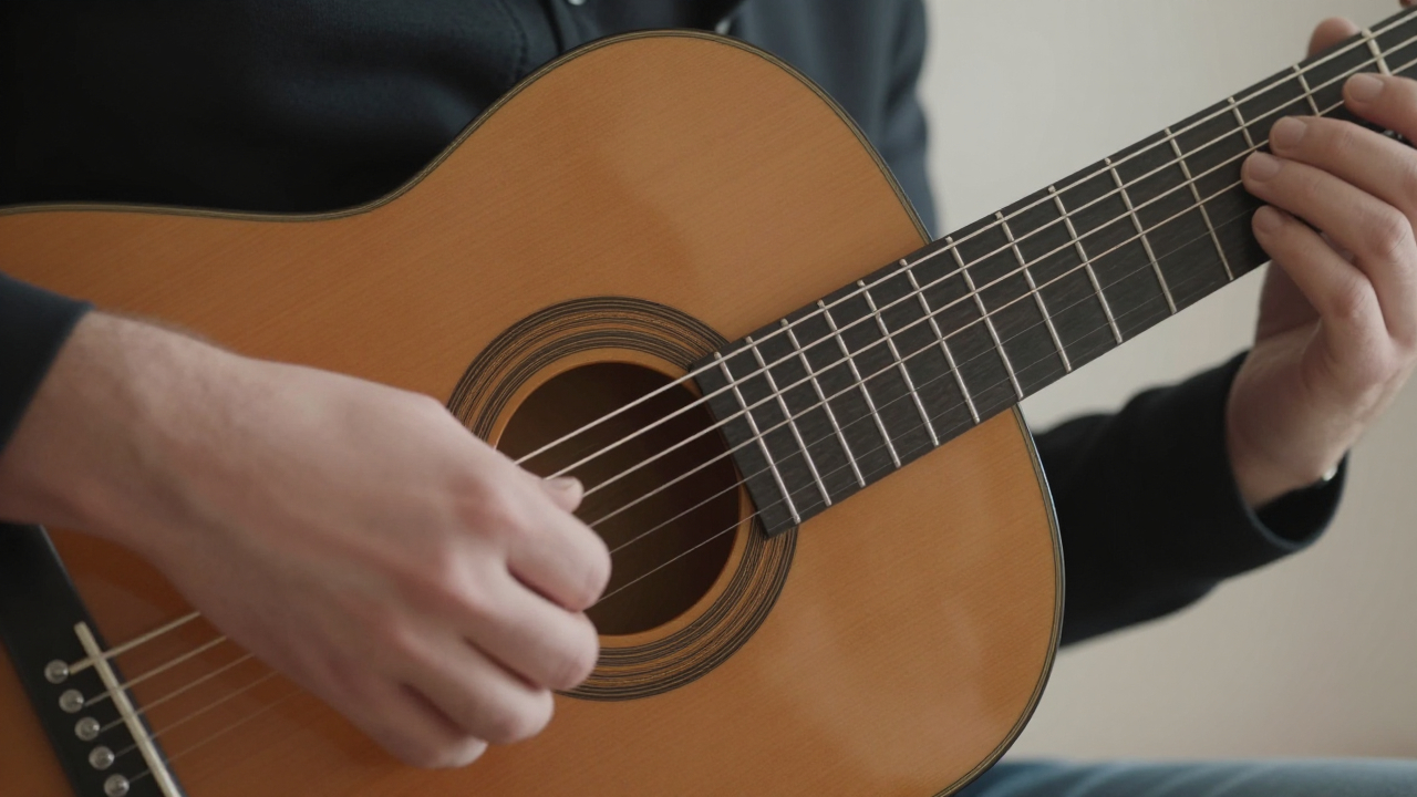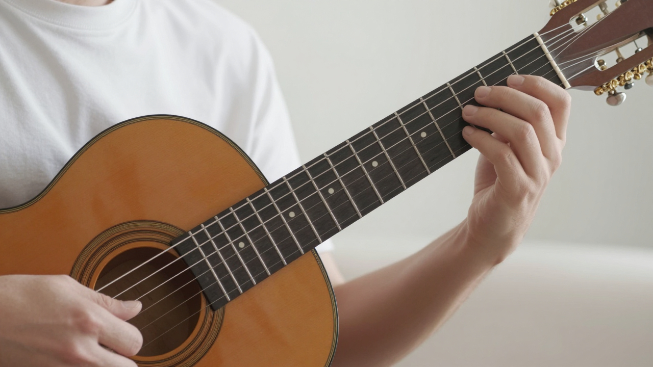 Руки на грифе классической гитары, мягкий свет.