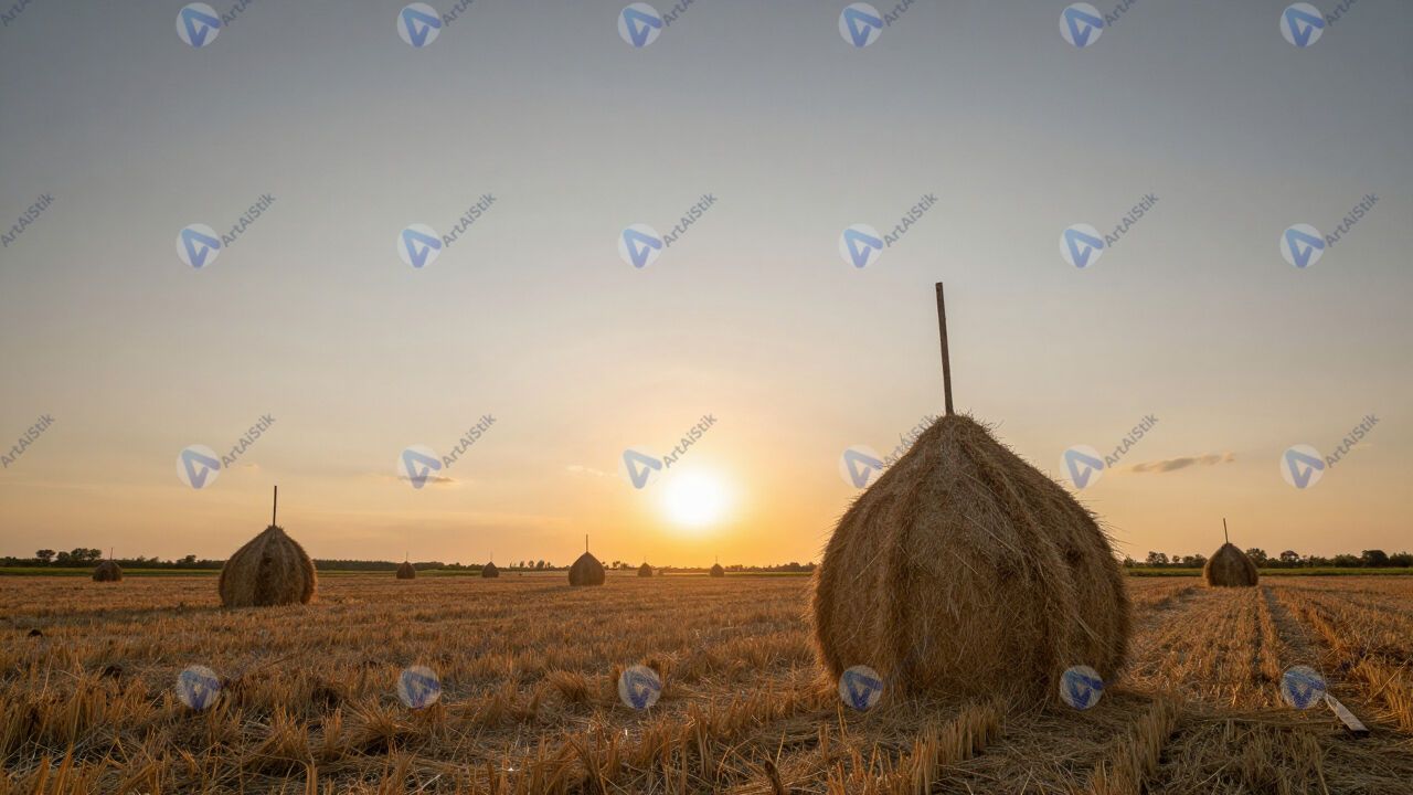 Сенокос летом, стога сена, закат, деревенский пейзаж.