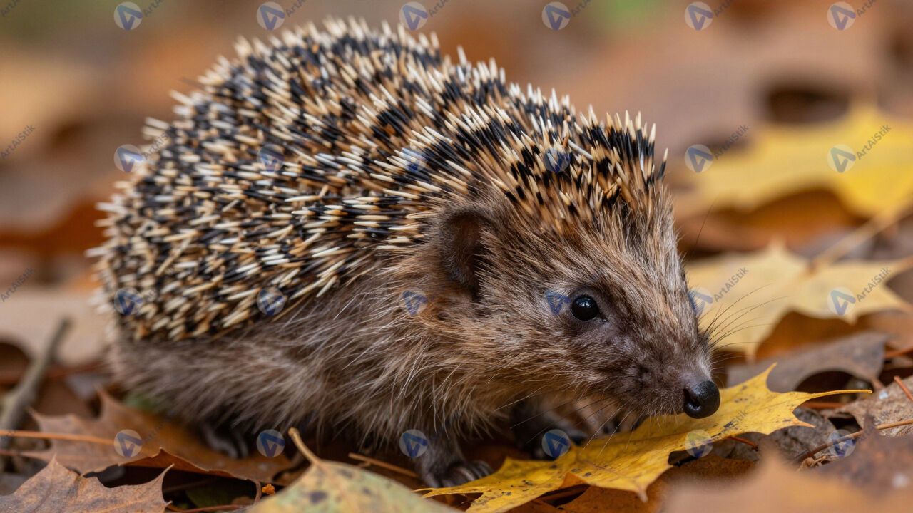 Ёжик в осенних листьях, иголки, крупный план.