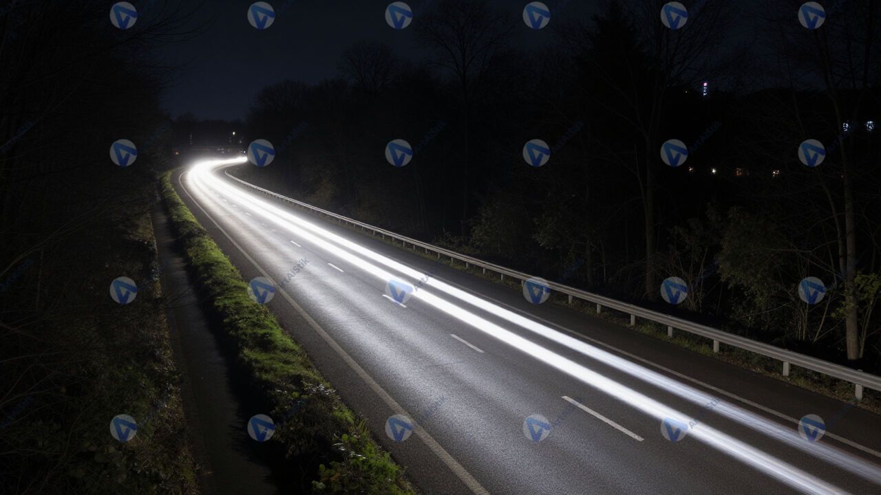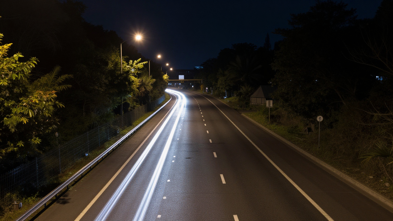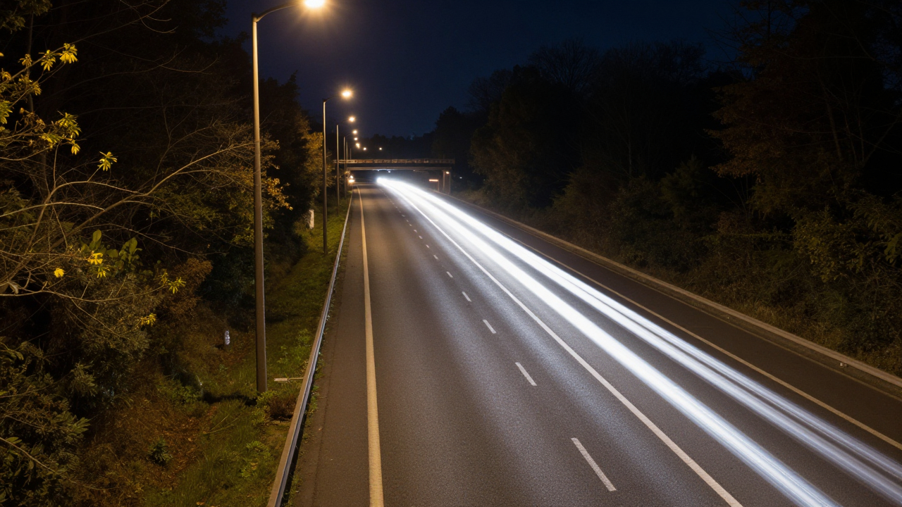 Шоссе в ночи, огни машин, длинная выдержка.