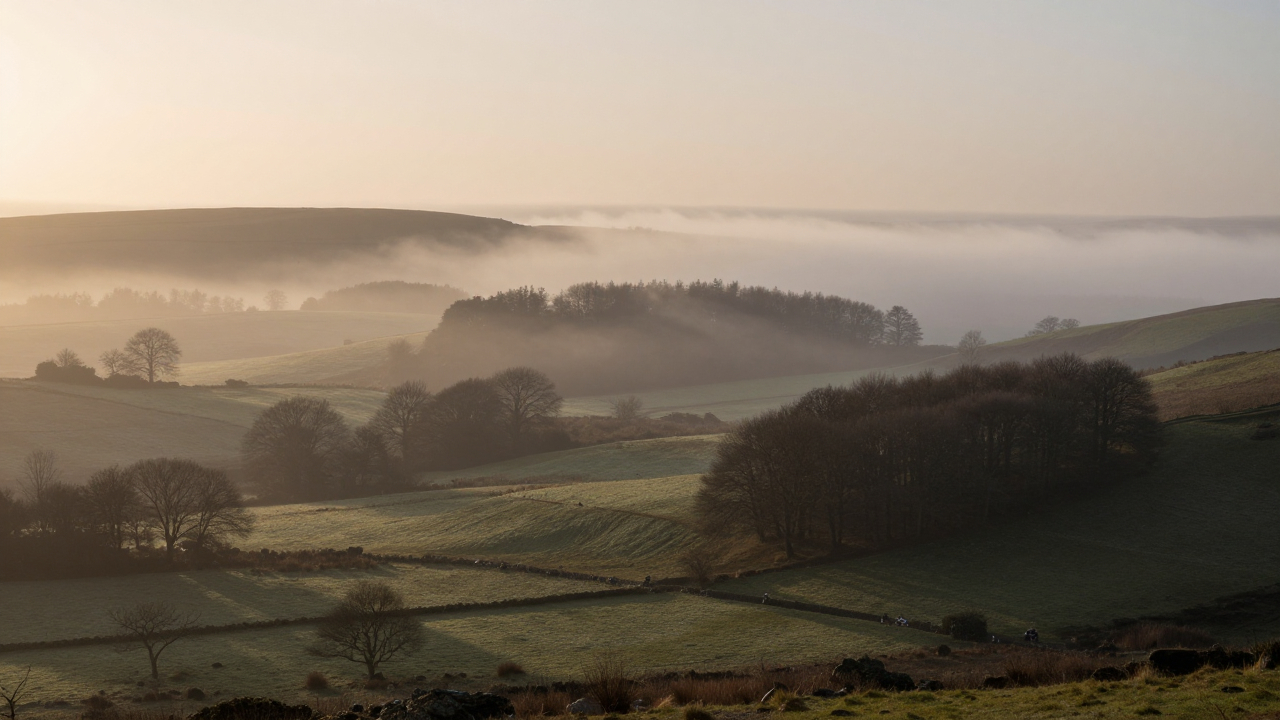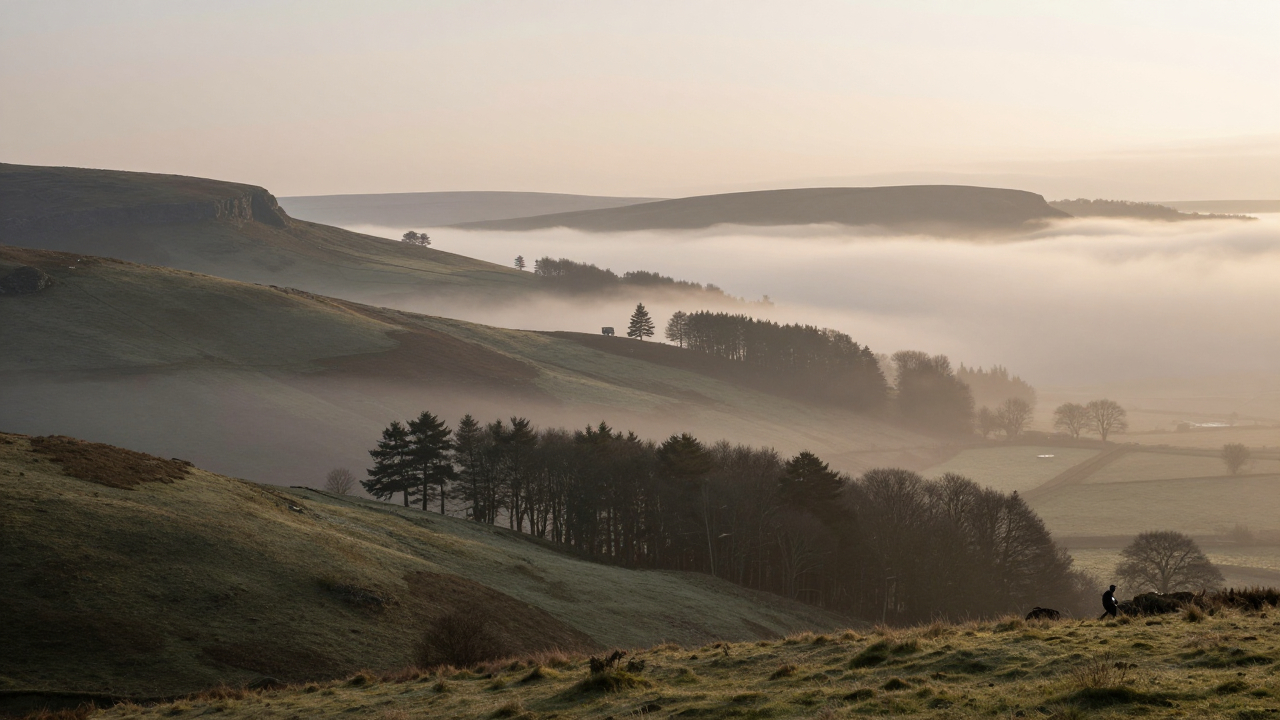 Холмистая местность с перелесками, туман в низинах, рассвет.