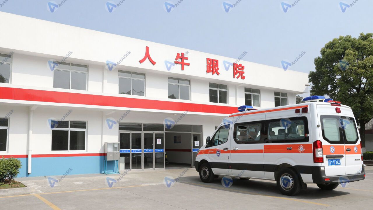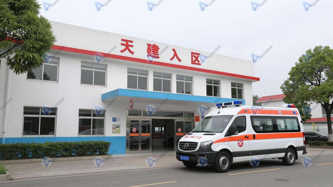 Болница с приёмным отделением и машиной скорой помощи у входа.