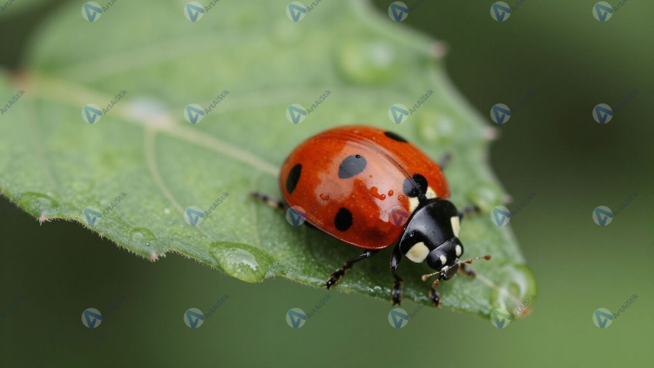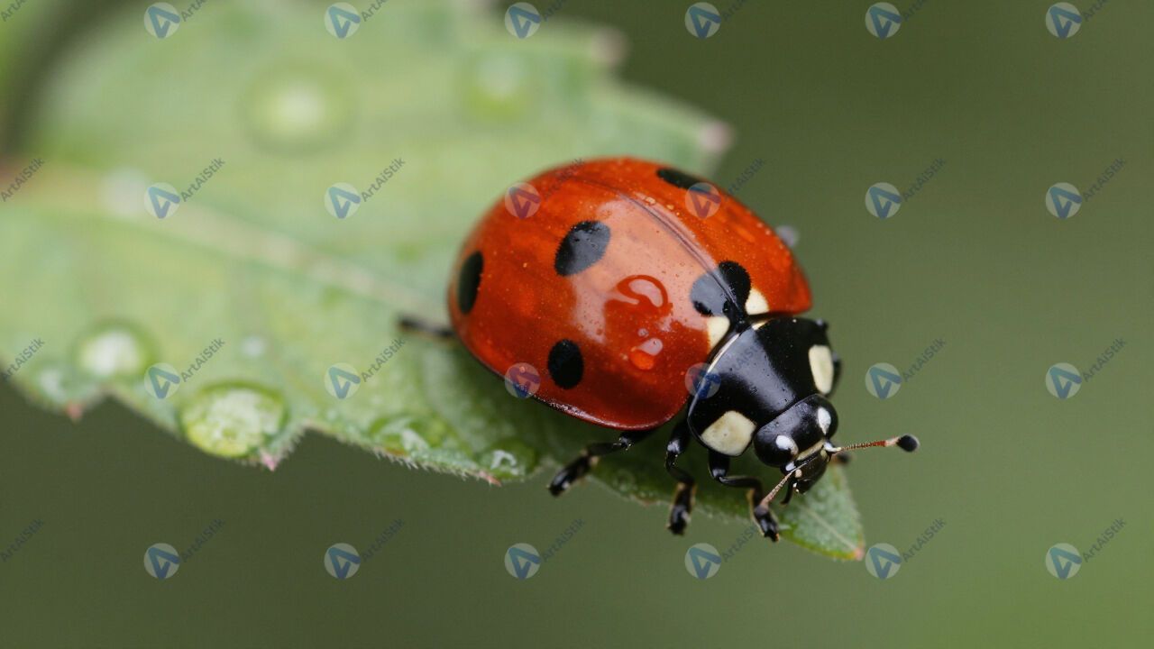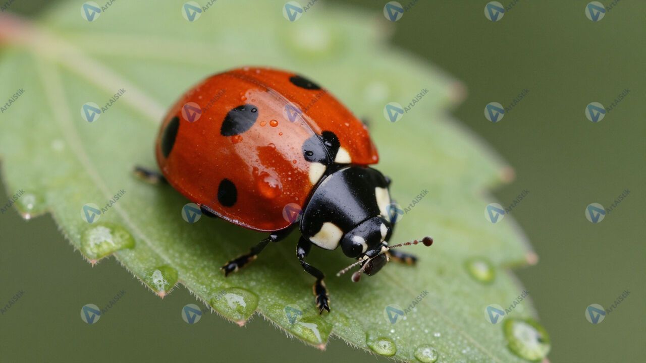 Божья коровка на листе, макро, капли росы.
