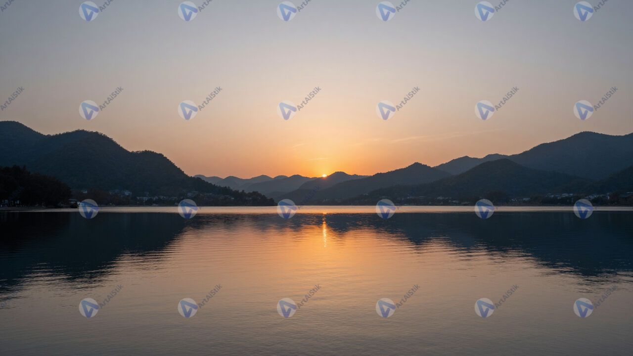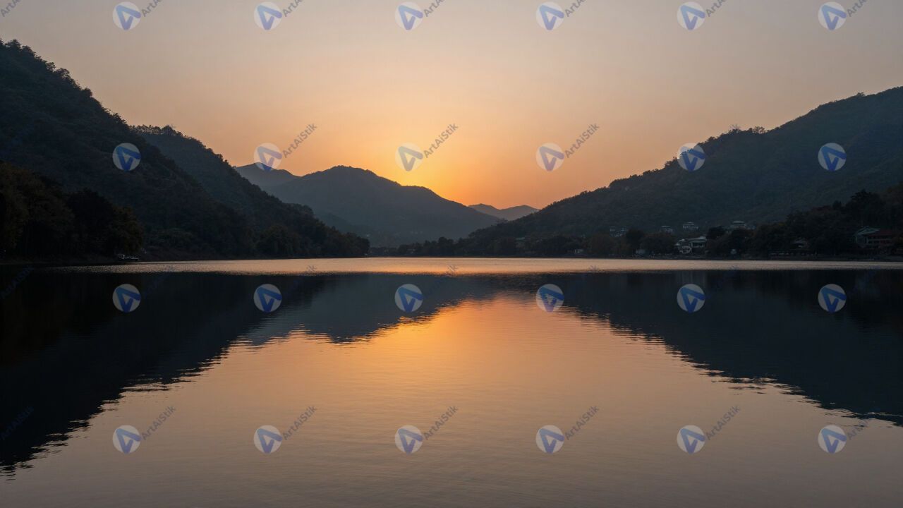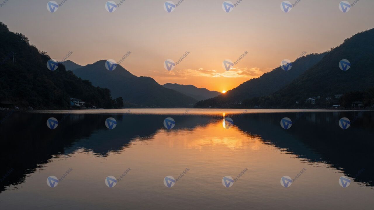 Озеро на закате, зеркальная гладь, горы по берегам.