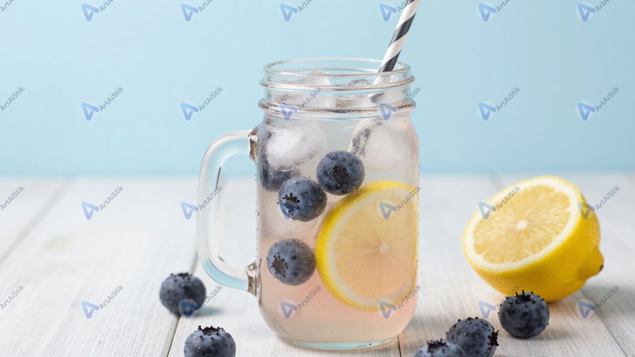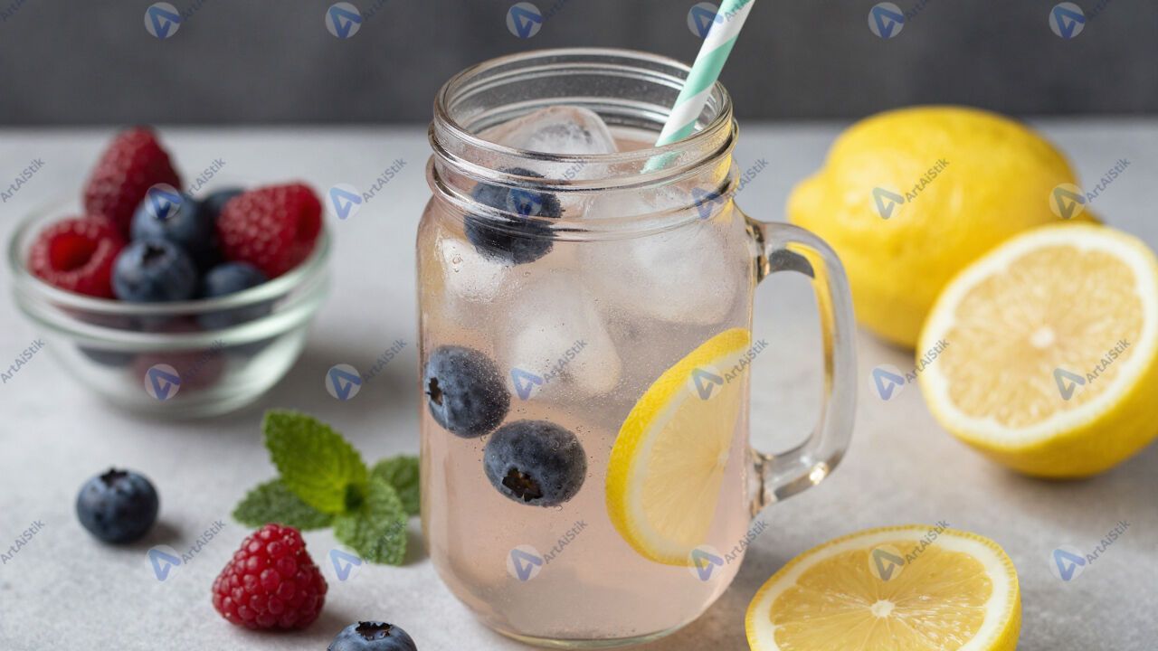 Лимонад с ягодами и кубиками льда в банке‑мэйсоне.