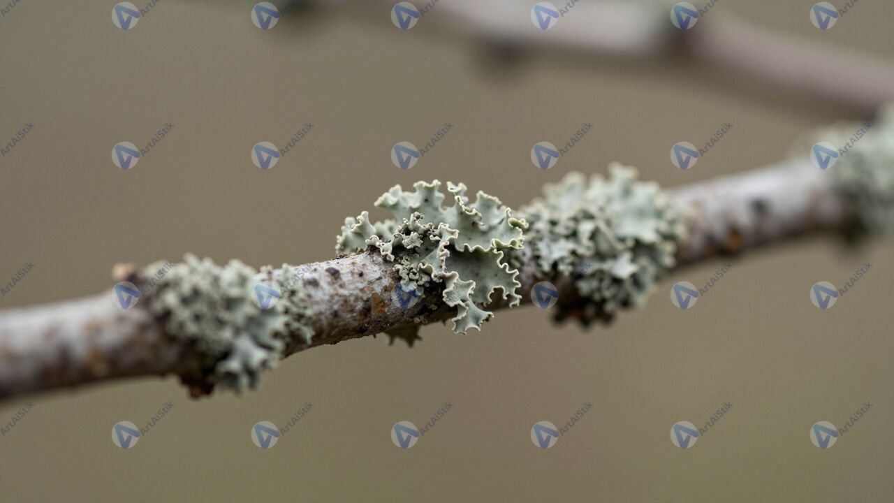 Лишайник на ветке, зелёно-серый, макро, размытый фон.