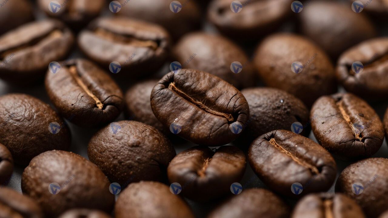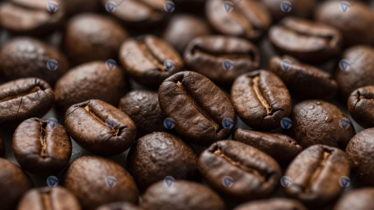 Макро‑фото зерен кофе, насыпанных плотным слоем.