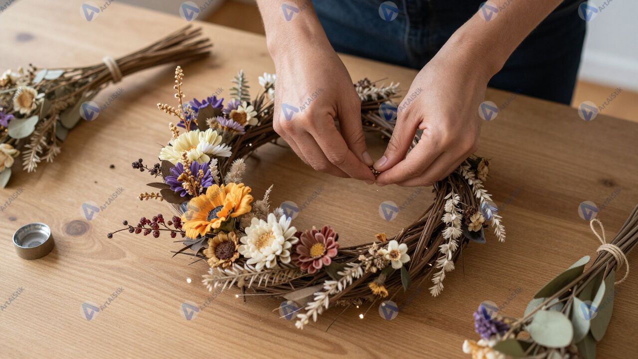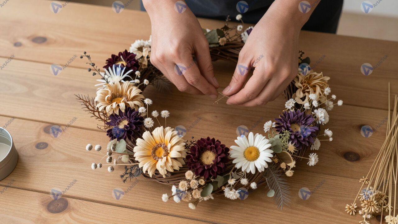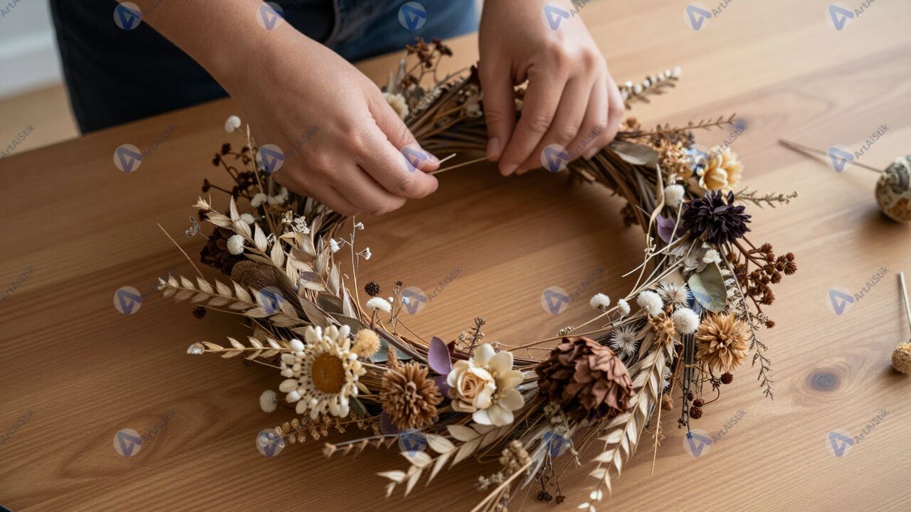 Изготовление венка из сухоцветов на деревянном столе.