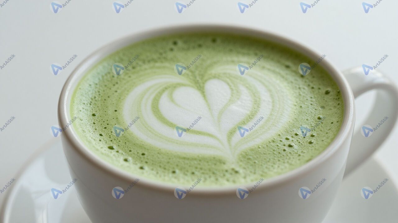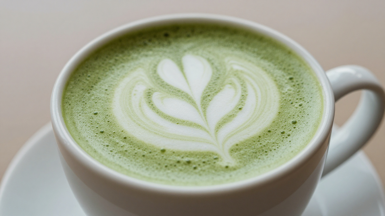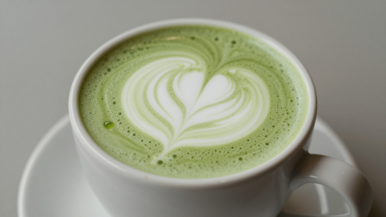 Матча‑латте в керамической чашке, ярко‑зелёная пена.