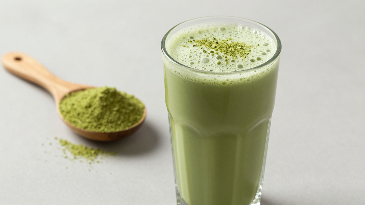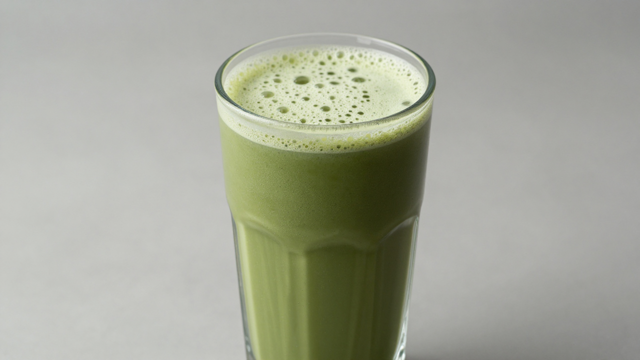 Матча‑смузи в высоком стакане, зелёный напиток.