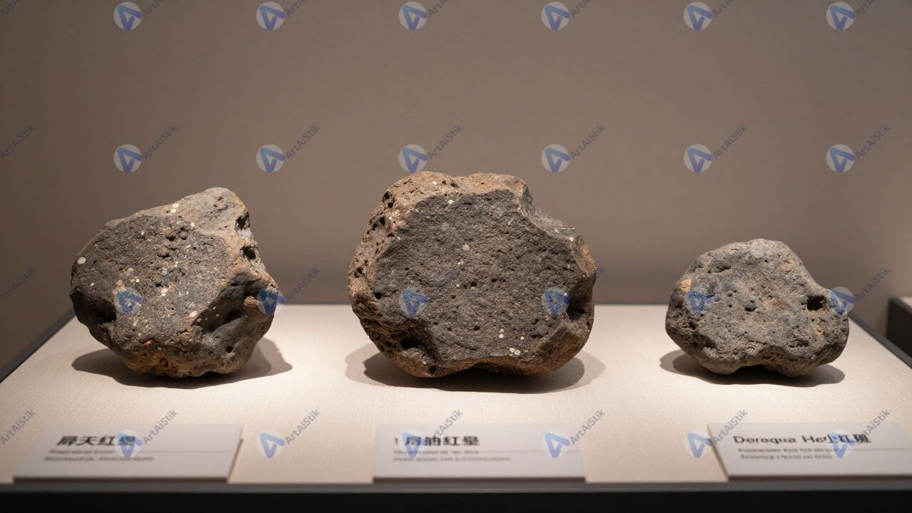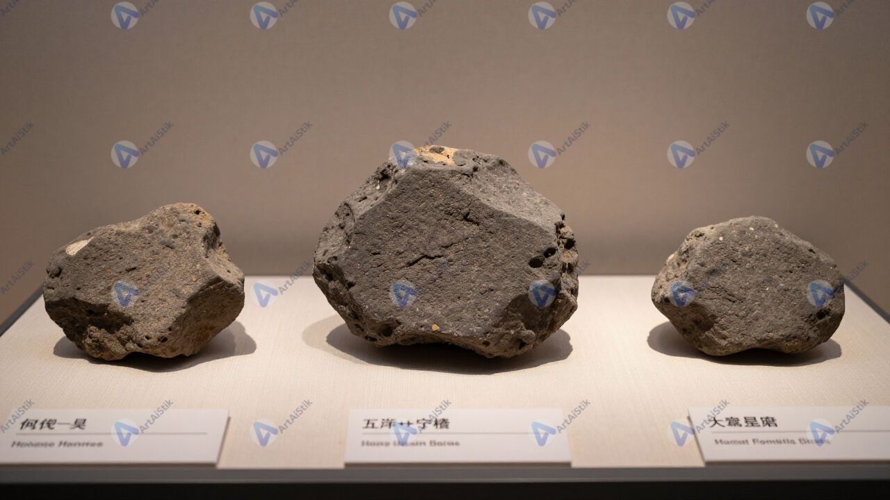 Камни‑метеориты на витрине музея с подписями.