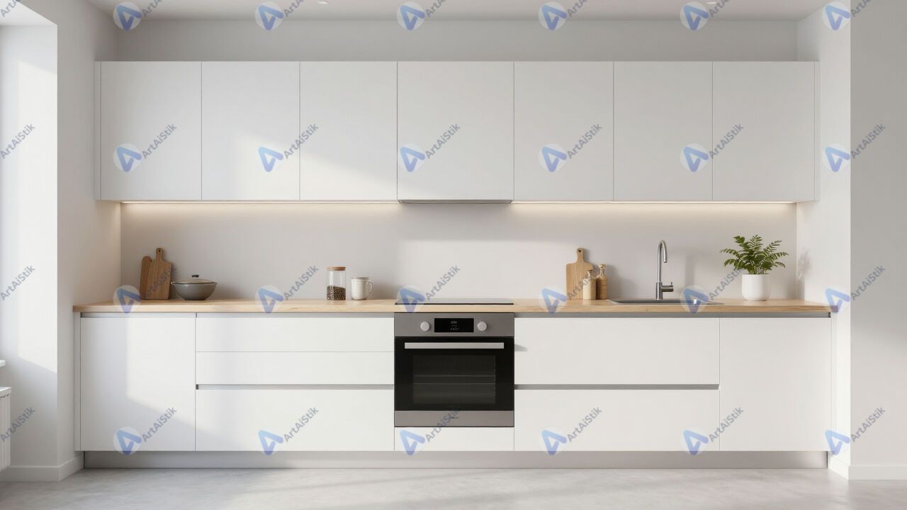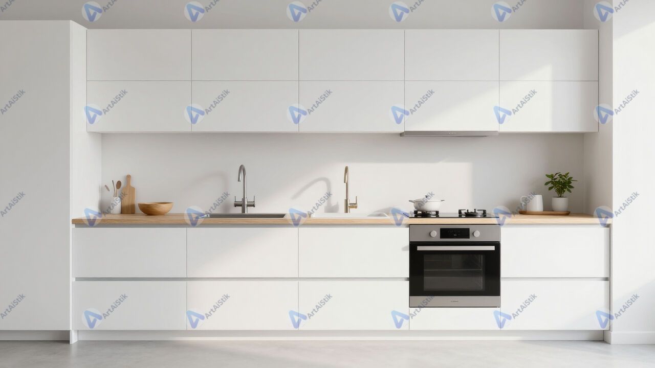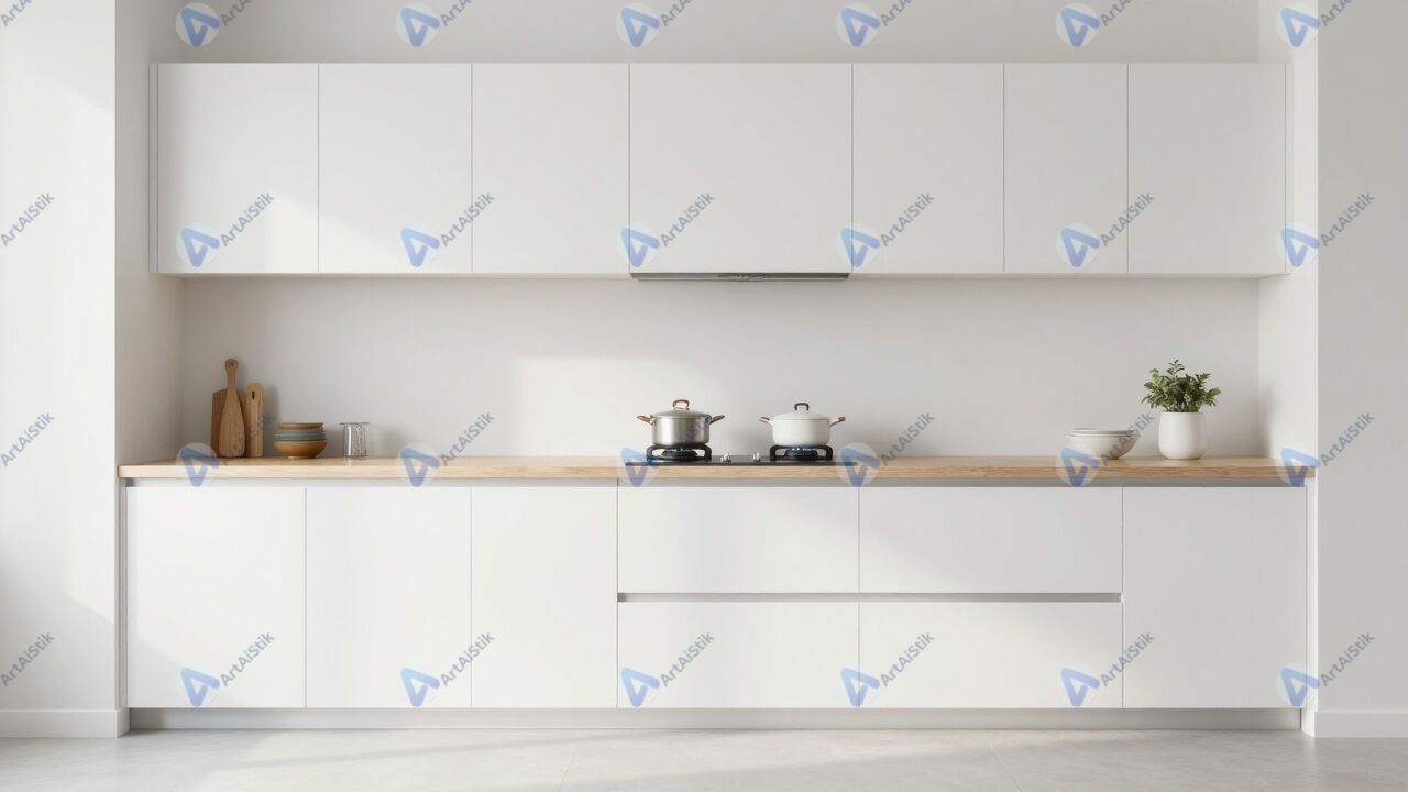 Минималистичная кухня в белых тонах с деревянной столешницей.