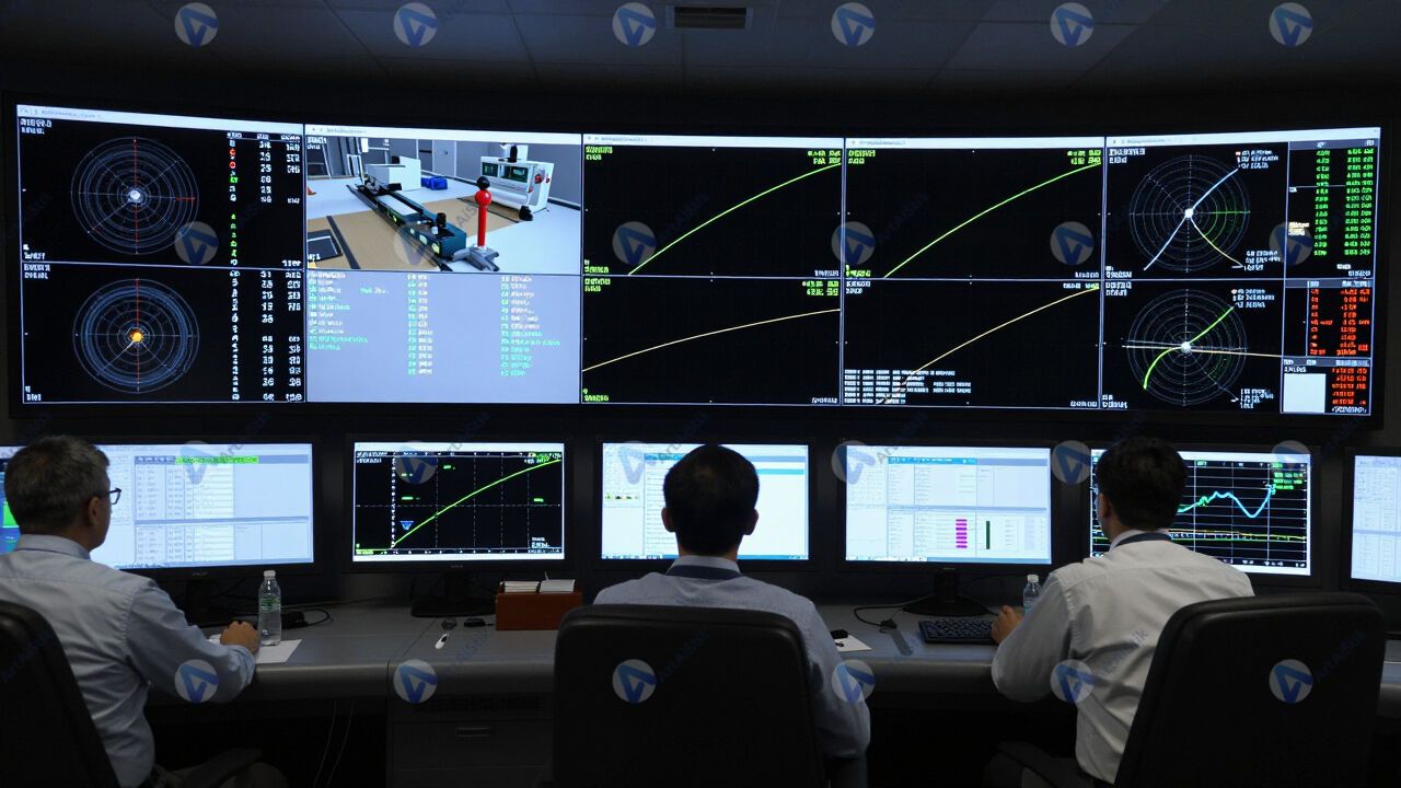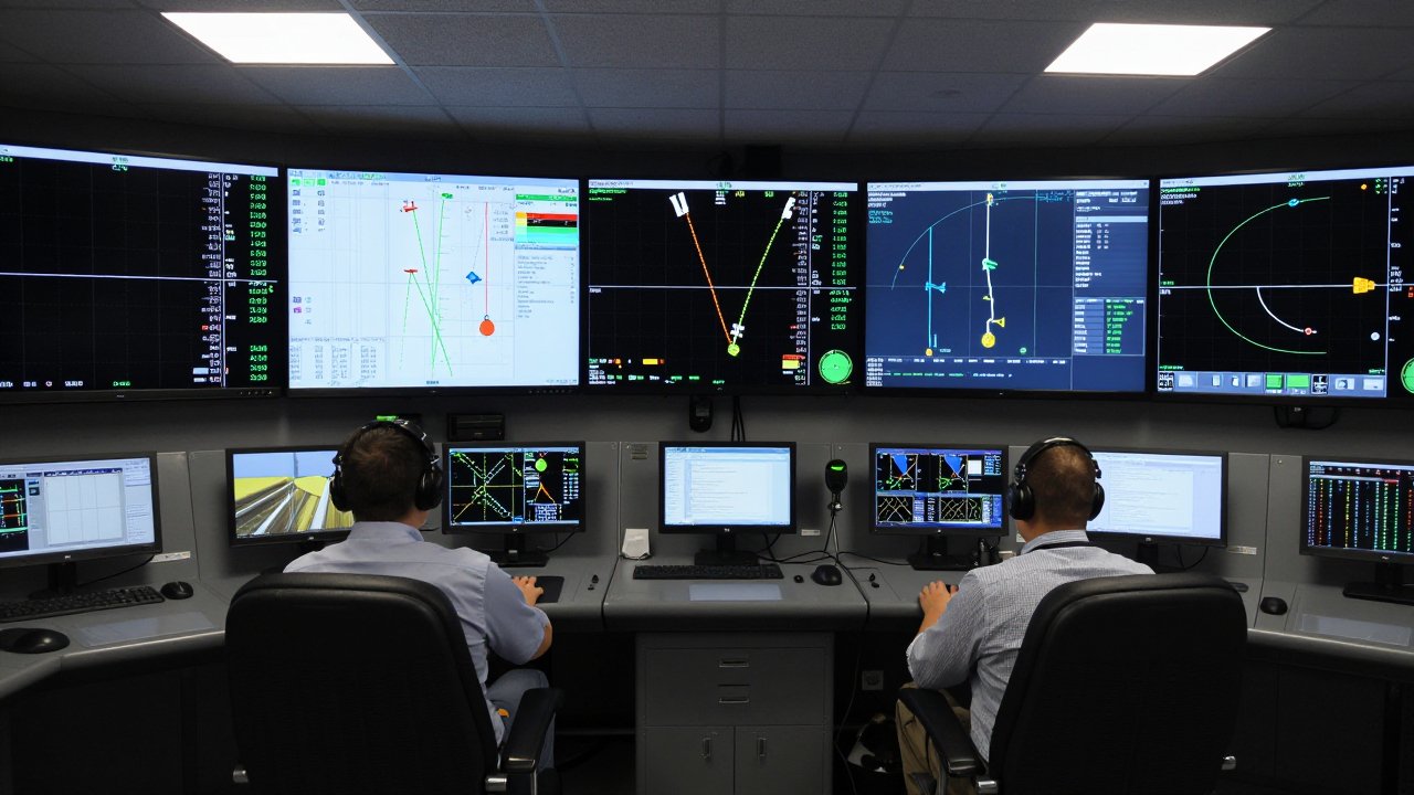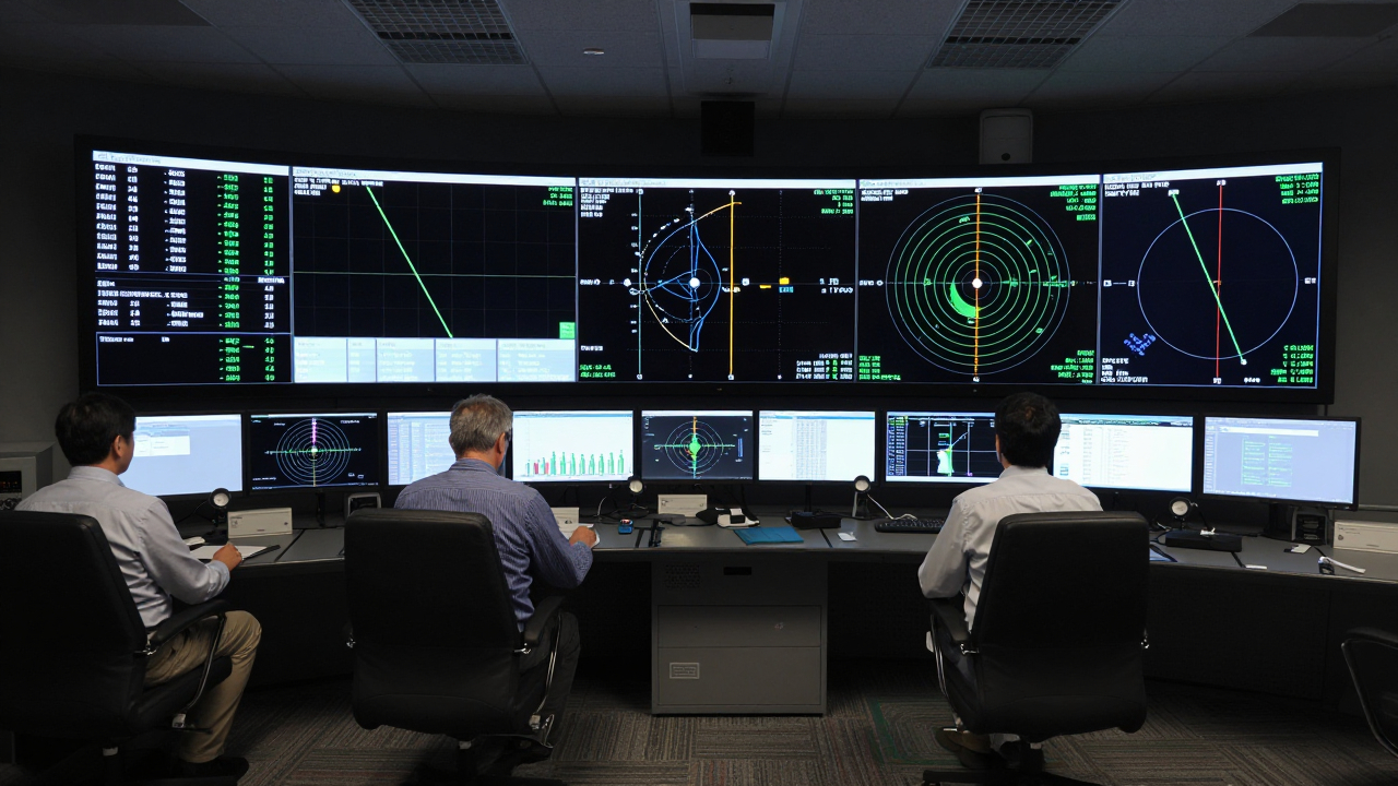 Зал управления полётом, экраны с телеметрией и траекториями.